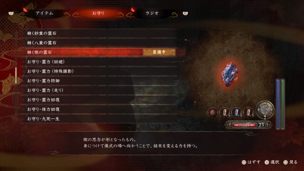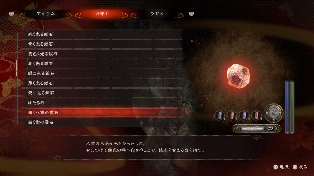 • 赫く禊の霊石」を装備した状態で贄座に入り「虚」エンディングを迎えると「赫く繭の霊石の欠片」を入手できる