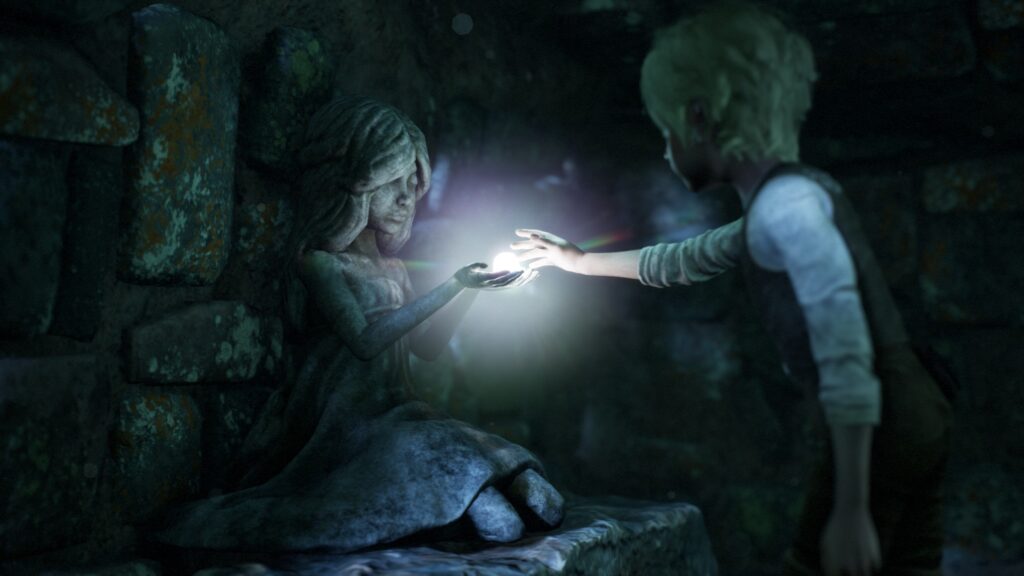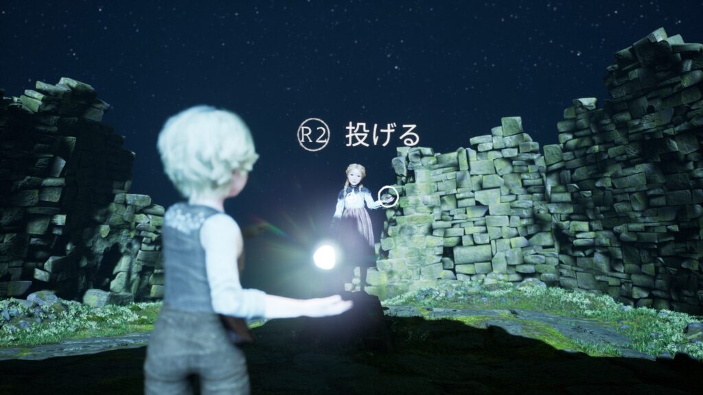 落ちた先で光る玉を見つける。