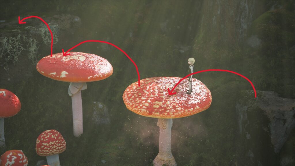 マッシュルームエリアはジャンプでキノコの上を飛んでいく。