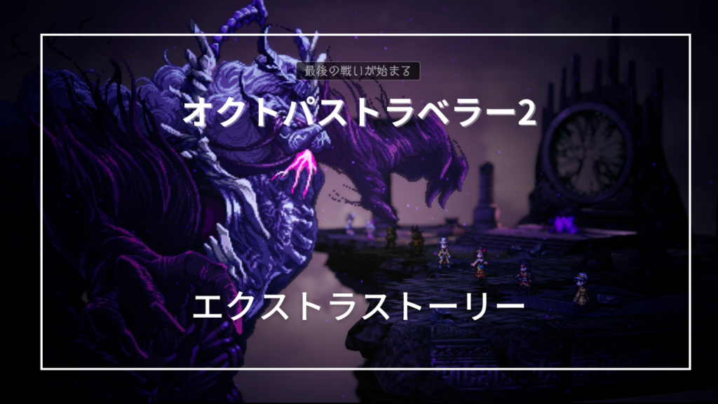 オクトパストラベラー2のエクストラストーリーの攻略です。 エクストラストーリー エクストラストーリーを開始するには8人のストーリーを終わらせ、クロスストーリーも前編後編共に終わらせると解放されます、 「南クロップデール森道」にある焚火に触れる... -