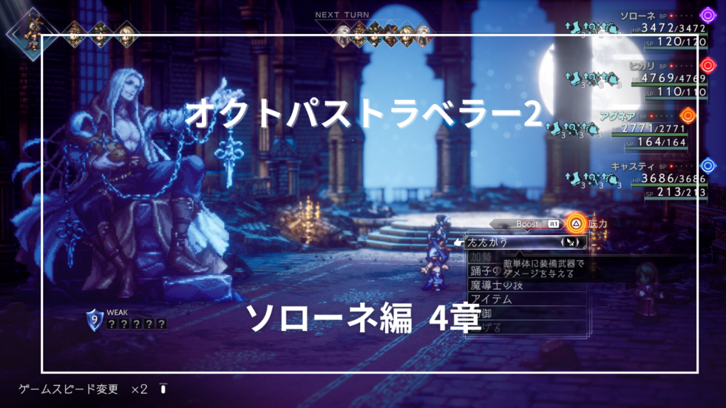 オクトパストラベラー2のストーリー、ソローネ編4章の攻略情報です。 ソローネ編4章 推奨レベル45 ソローネ編の4章はニューデルスタから始まります。 ニューデルスタに戻ってきたソローネ。両親を殺して奪った鍵では、首輪を外すことができなかった。そ... -