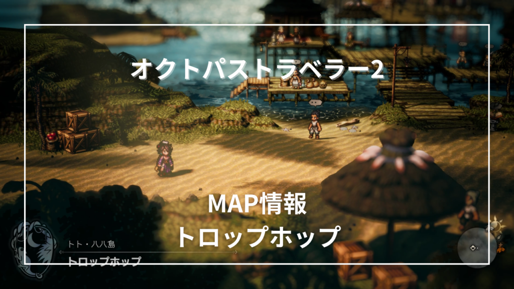 オクトパストラベラー2のMAPトト・ハハ島「トロップホップ」の情報です。 トロップホップ トロップホップは「アグネス編3章」で訪れる町です。 サイドストーリー ねぼすけ漁師 1.漁師の親方から受注 2.ねぼすけ漁師をコマンドで倒す 4800リーフ 回避増強の... -