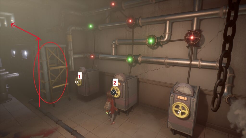 そうするとハシゴの上の蒸気が消えて通れるようになります。