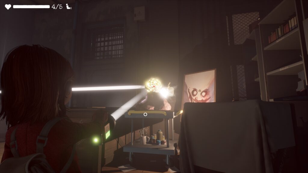缶を取って部屋に入り、奥の上で光っているバルブの先を缶を当てて落とします。