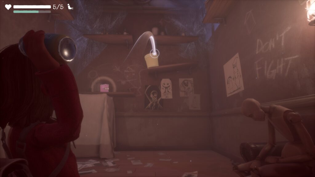 奥の中段にあるバケツを缶で狙い、当てることで「本:見てるだけの人たち」を獲得。
