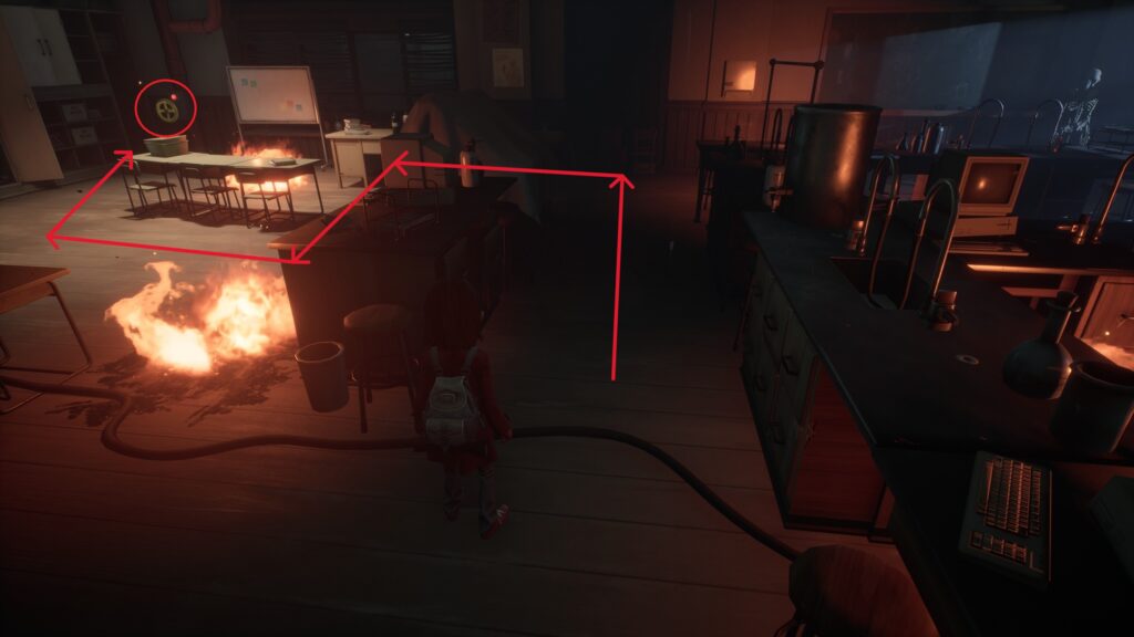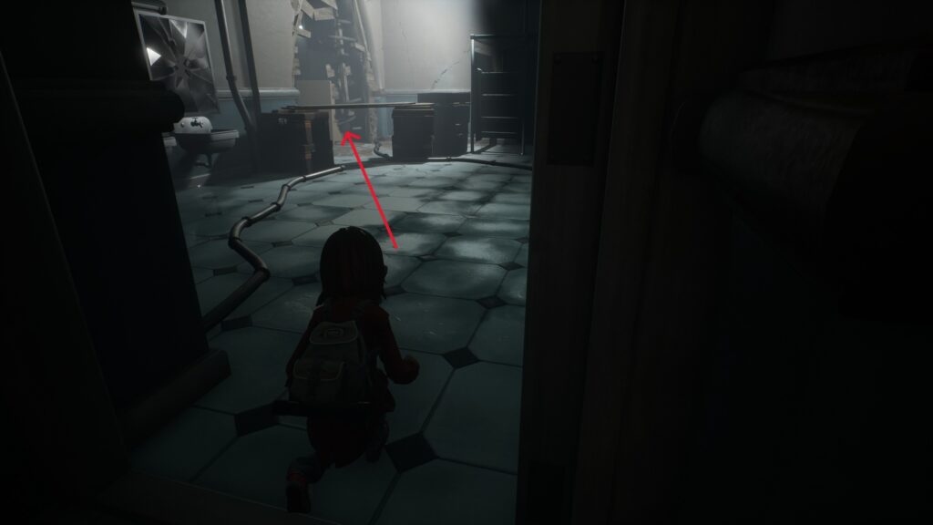 バルブを閉めたら階段を降り、ハシゴを青矢印の場所に持ってくることで換気口を通れるようになります。