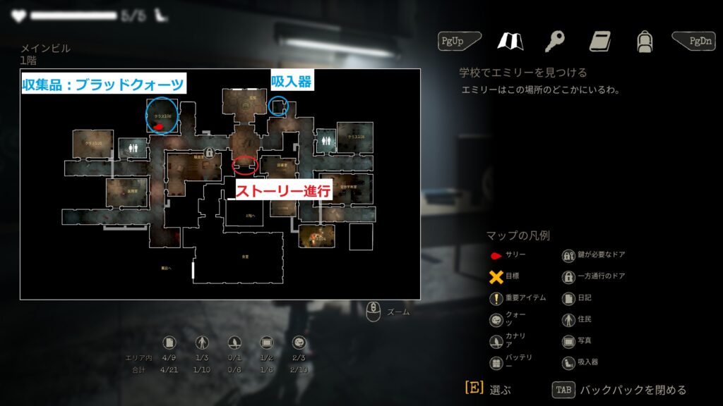 赤丸がストーリー進行、青丸がそれぞれ吸入器、収集品:ブラッドクォーツとなります。