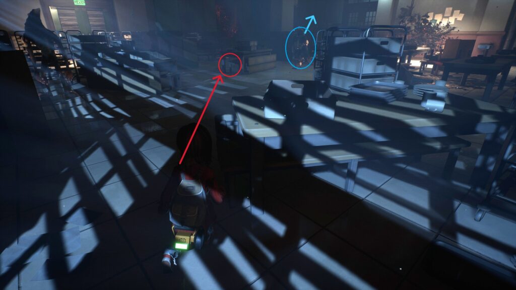 ドアを出ると敵がいて通れなくなっているので向こうを向いている隙に換気口から先へ進みます。