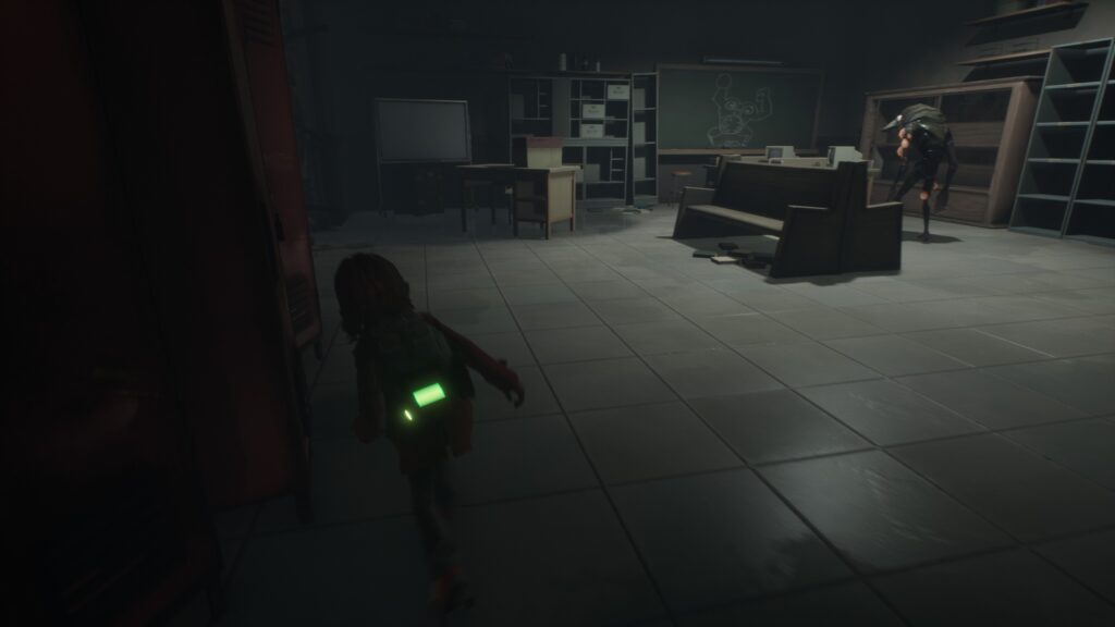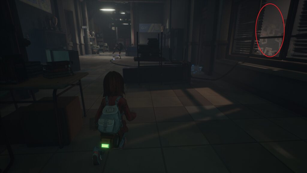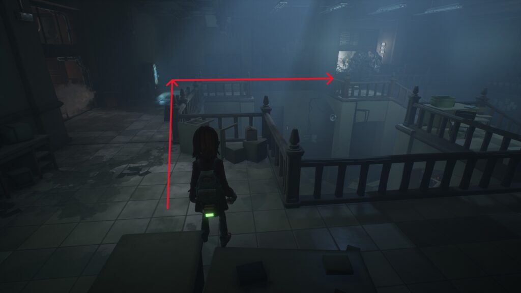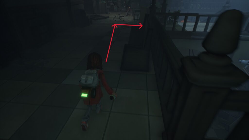 クラス203では手前のベンチに隠れて、敵が向こうを向いたタイミングで壁際をしゃがんで通ります。