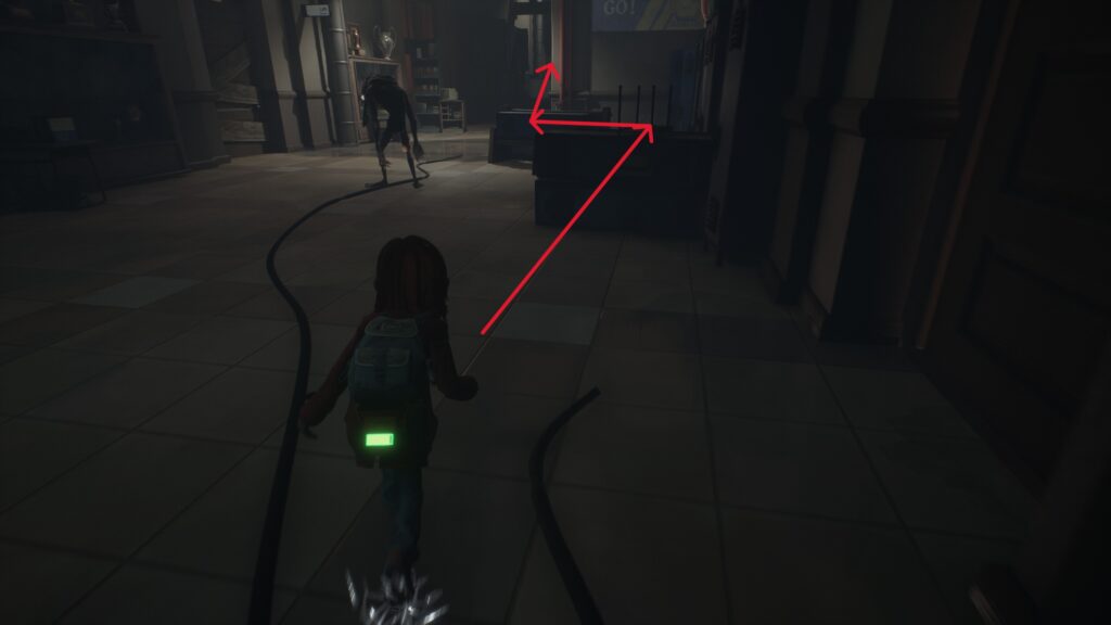 次は壁際を通って2体の間をしゃがんで通ります。