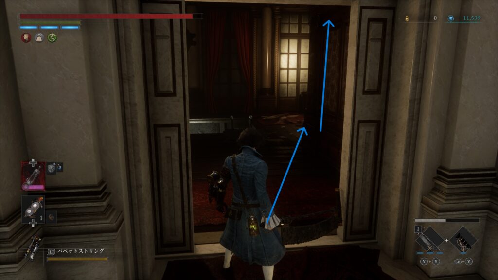 道なりに進み2階へ上がった突き当たりの部屋にハシゴが隠れている