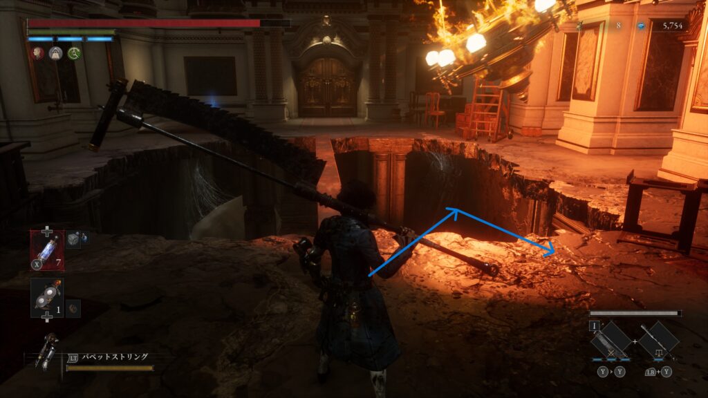 ボス前の振り子がある橋から飛び降りる