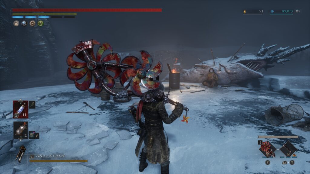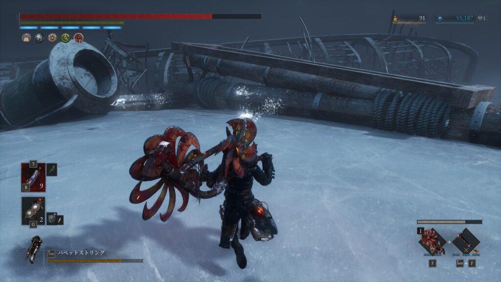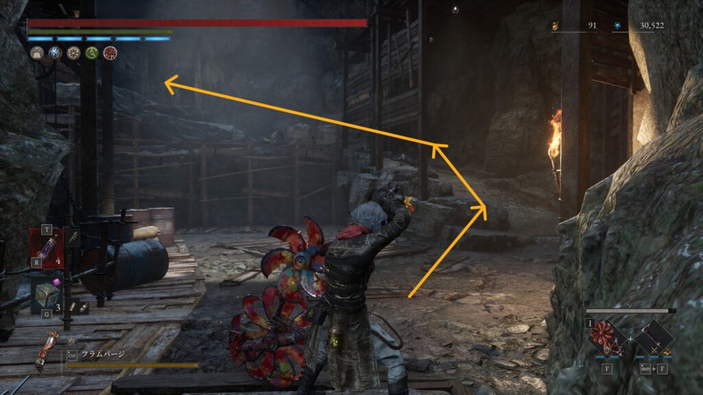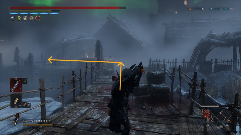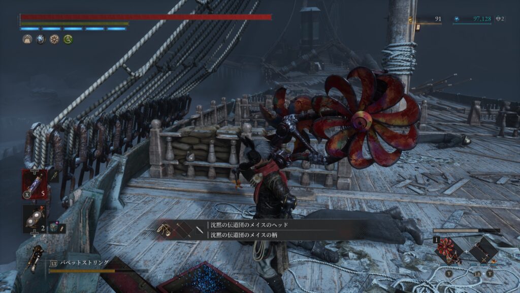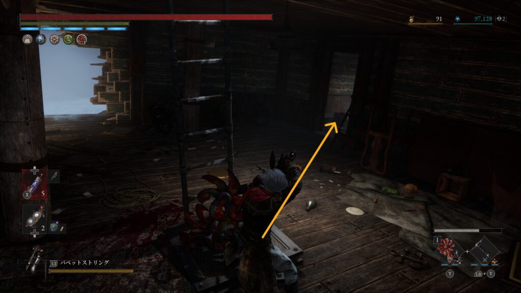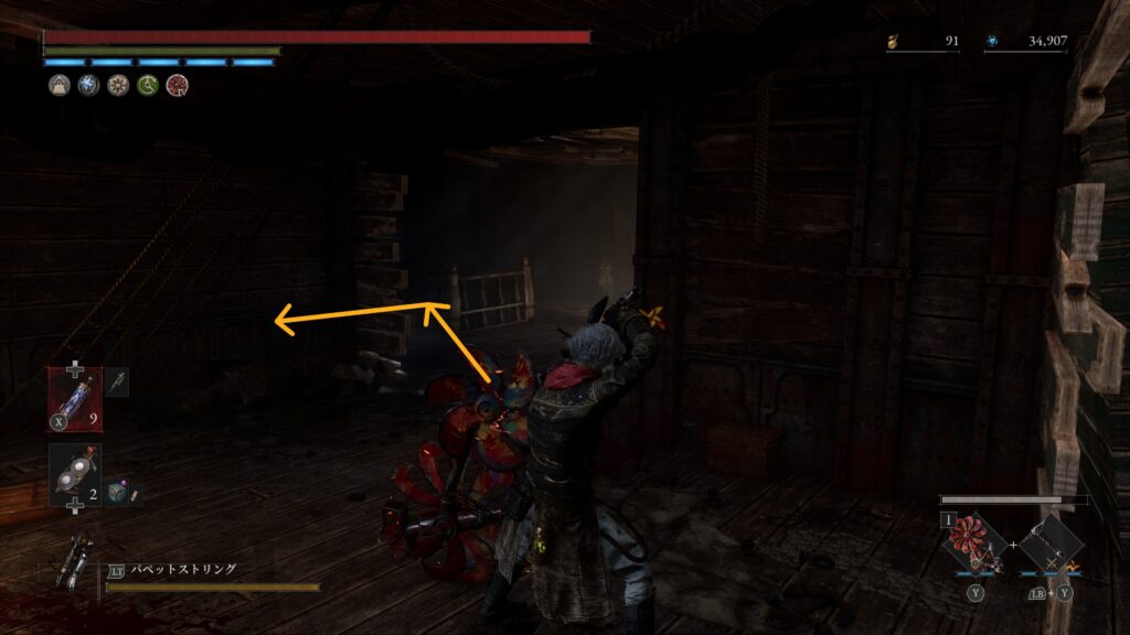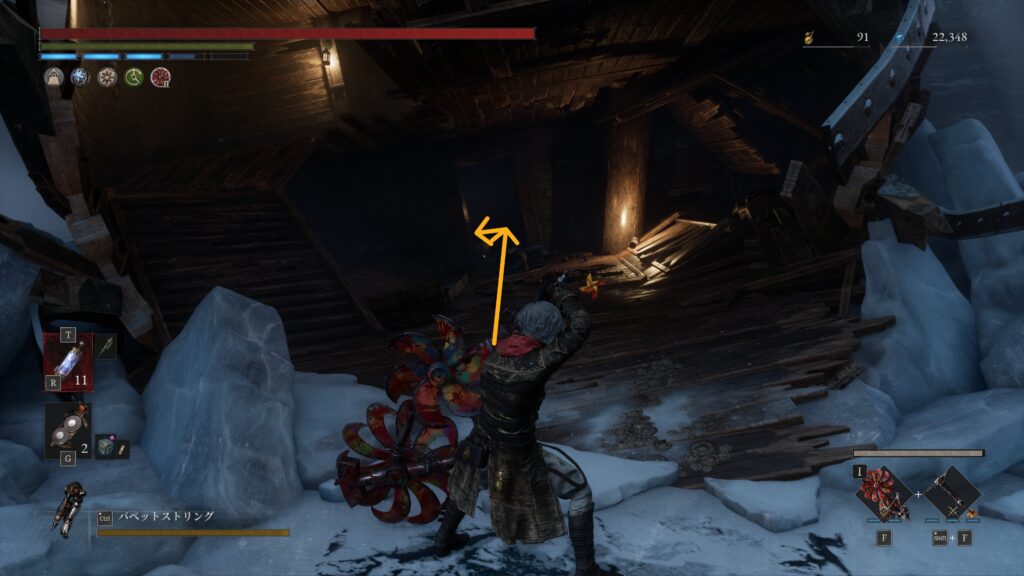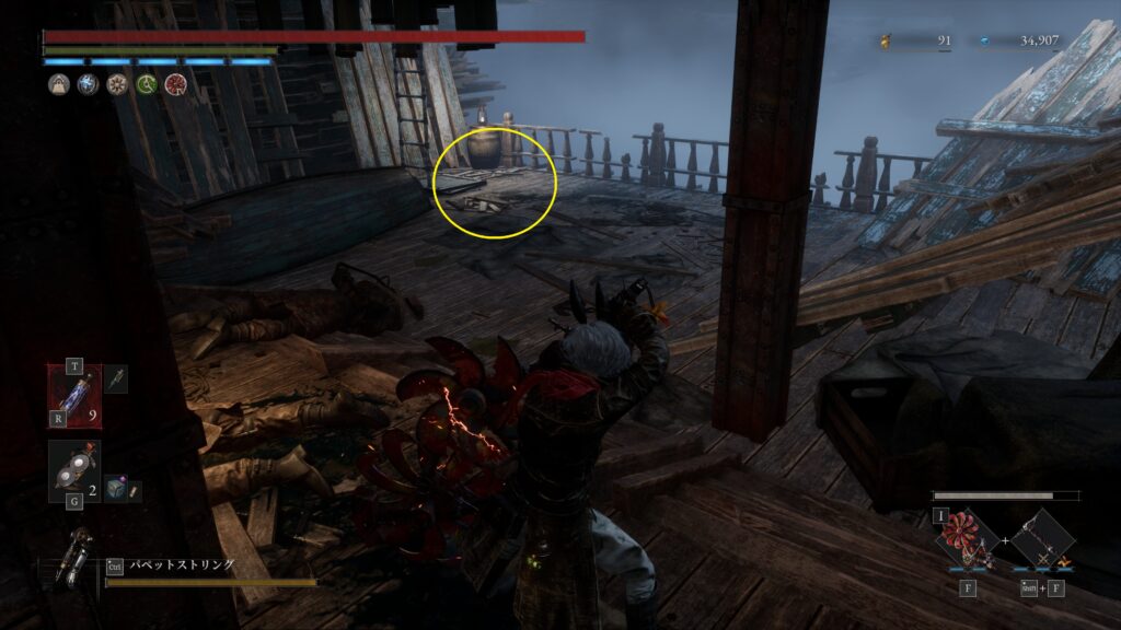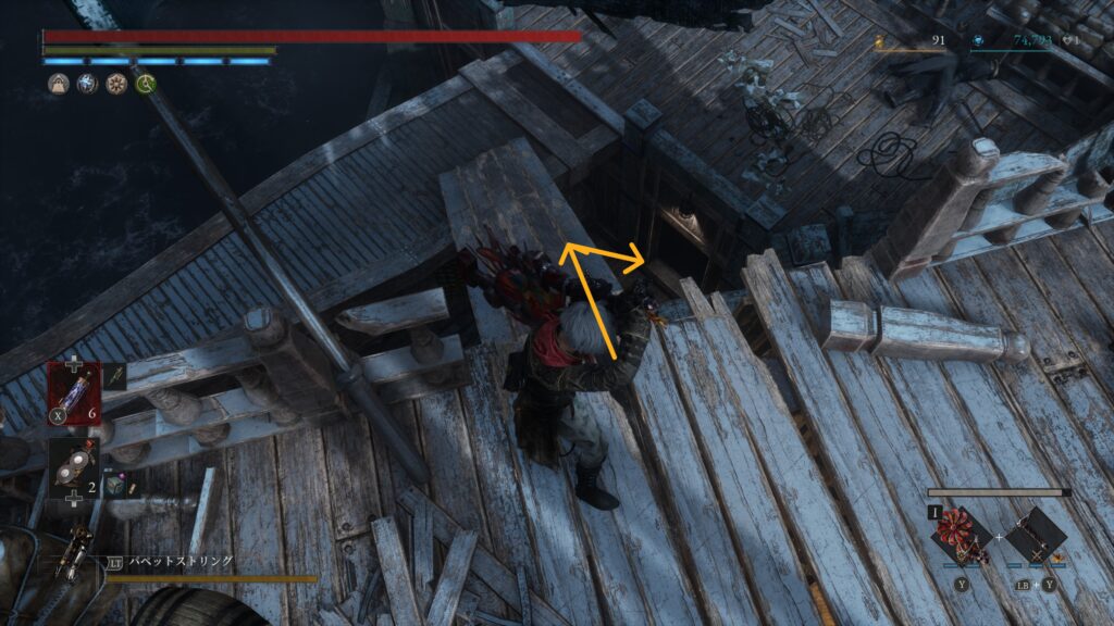 大砲エリアを抜けた先の難破船でハシゴを使って甲板に上がる