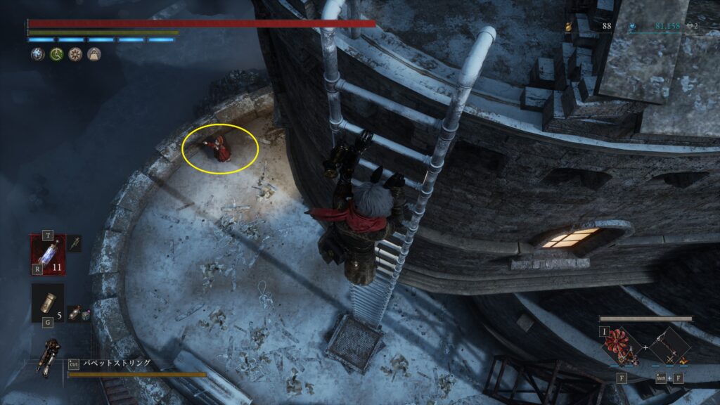 ハシゴを使い外側を下に降りていく途中にいる
