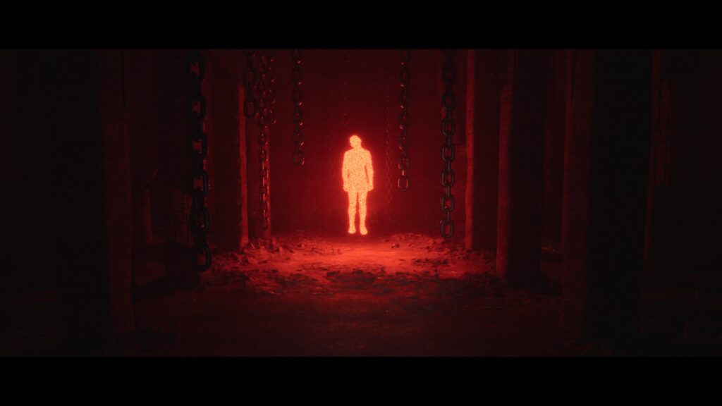 両壁に扉が大量にある廊下で後ろから人型が追いかけてくるシーン