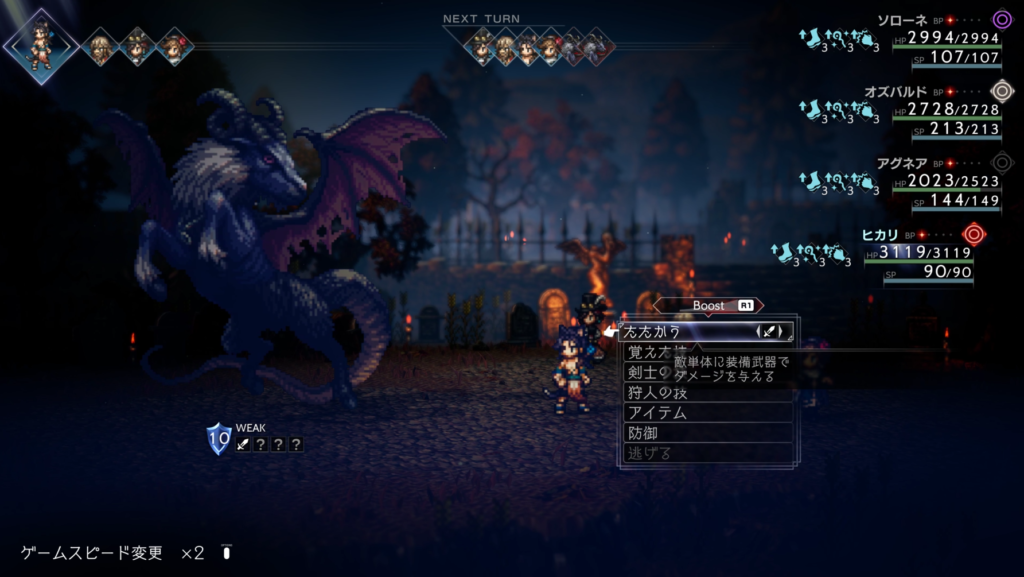 暗闇、物攻ダウン、闇のとばりを付けていれば難易度が下がります。