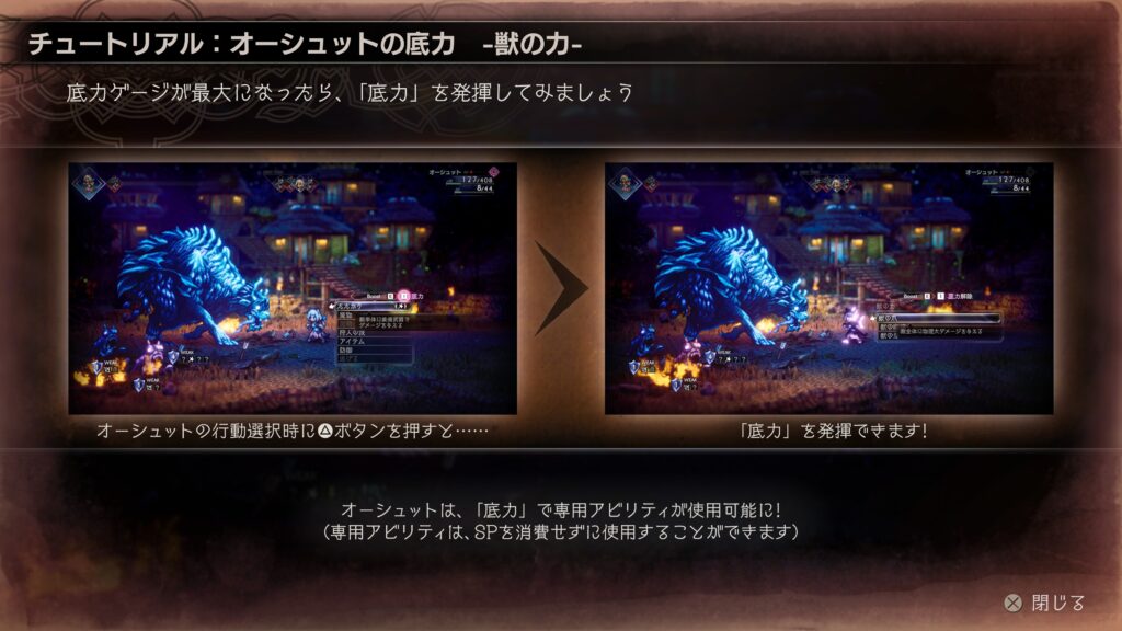 「獣の力」は「獣の爪」「獣の咆哮」「獣の牙」とあり、それぞれに対応した技を繰り出すことができる。