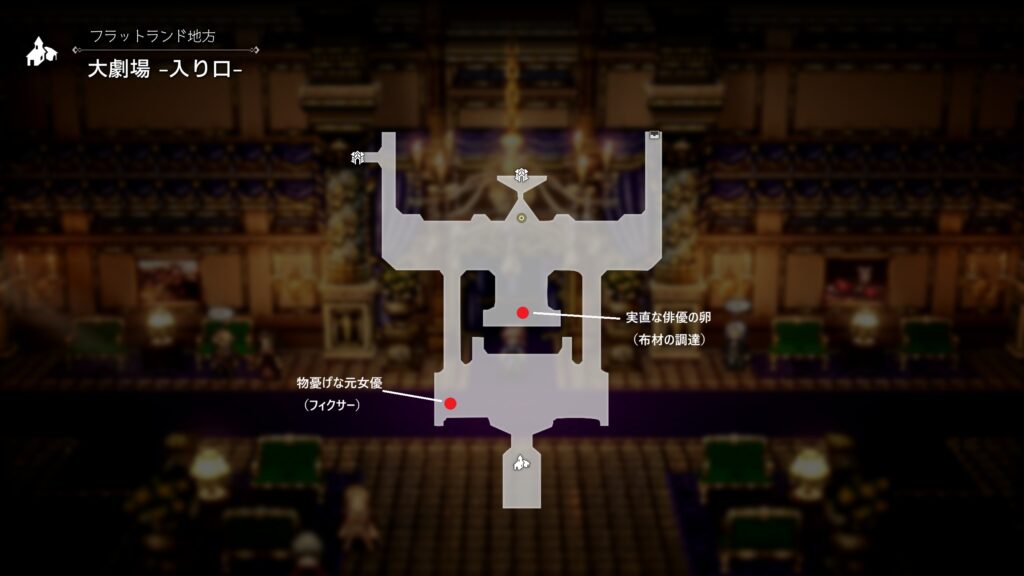 | 観劇目当てに来る観光客で儲けている商人。 演者と仲良くなり、彼らの私物を手に入れて 売りさばくことで多大な利益を得ている。 今は、魔物使いの狩人の一族を題材とした 演劇で使われた道具を売っているらしい。 | |||