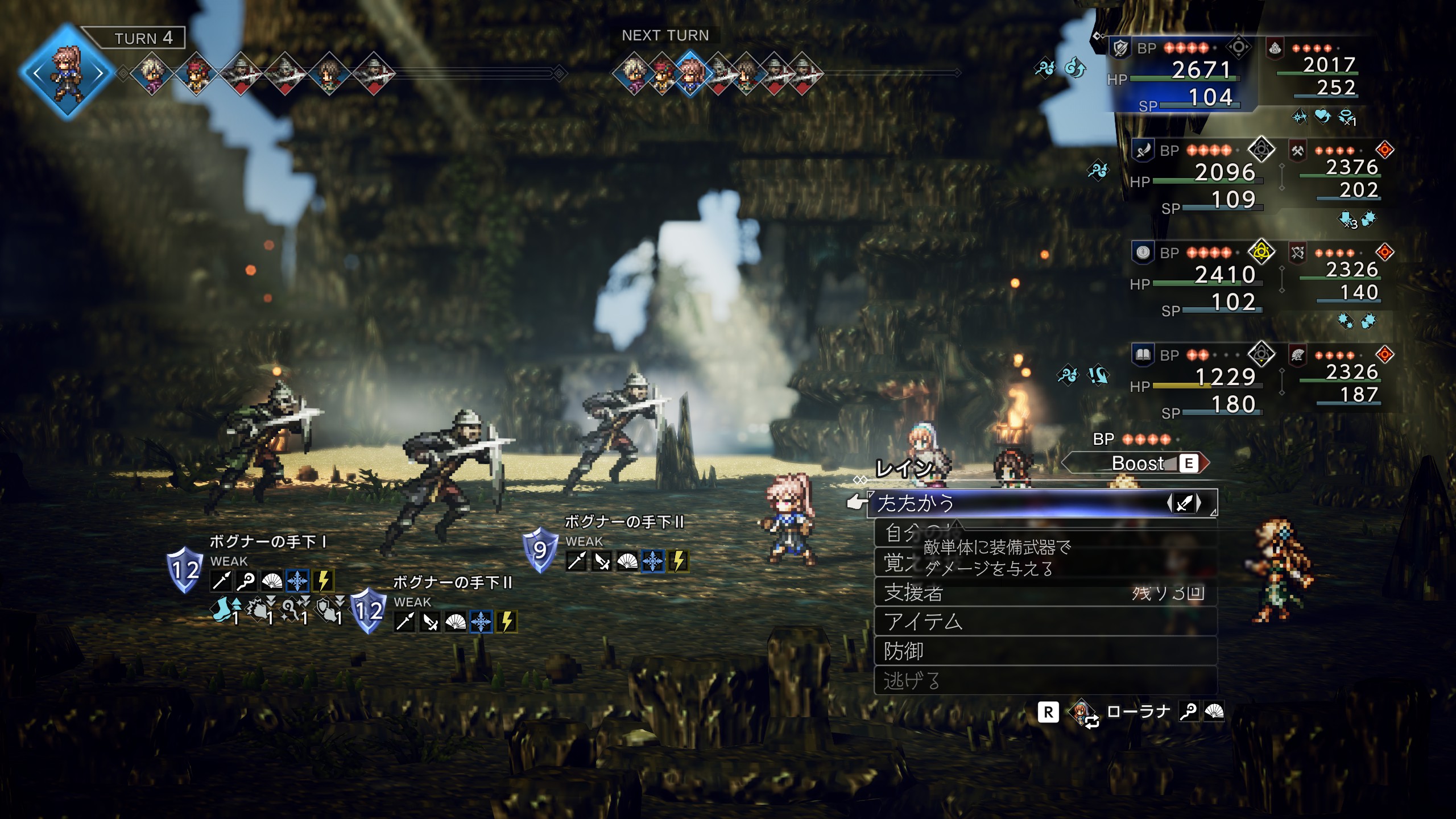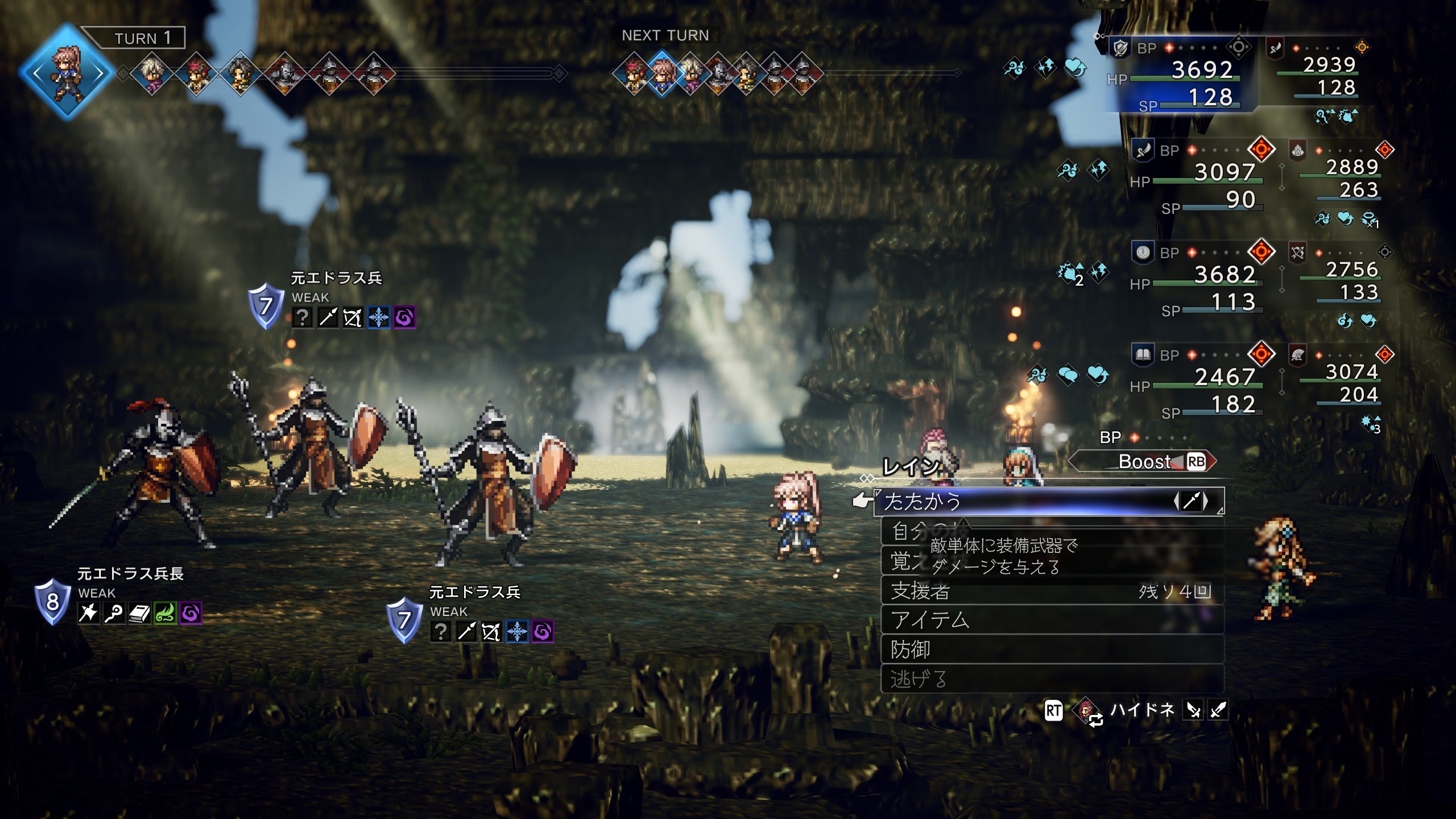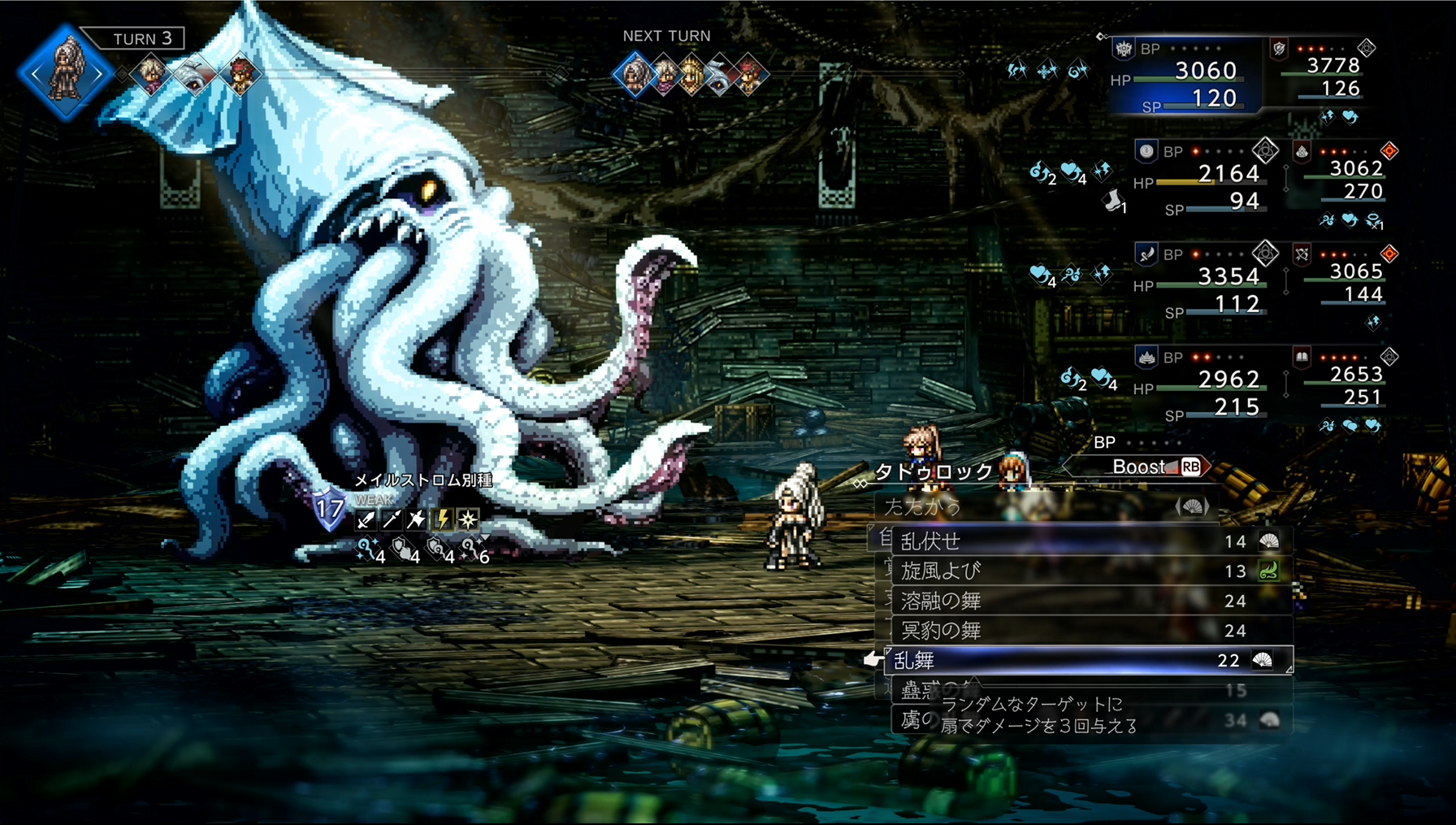 | 攻撃が非常に強力かつ1ターン中に2回攻撃なので注意 物攻ダウンで被ダメが減るのでオススメ 「防壁のオーラ」も使用して味方が落ちないようにしよう。 シールドが24とかなり高いので「全てを極めし者 第4章」で入手した「トリプルアタックの極意」が有用。 「物攻増強のナッツ」が盗めるので盗んでおこう。 ロッソを撃破するとプリムロゼが加入 | |