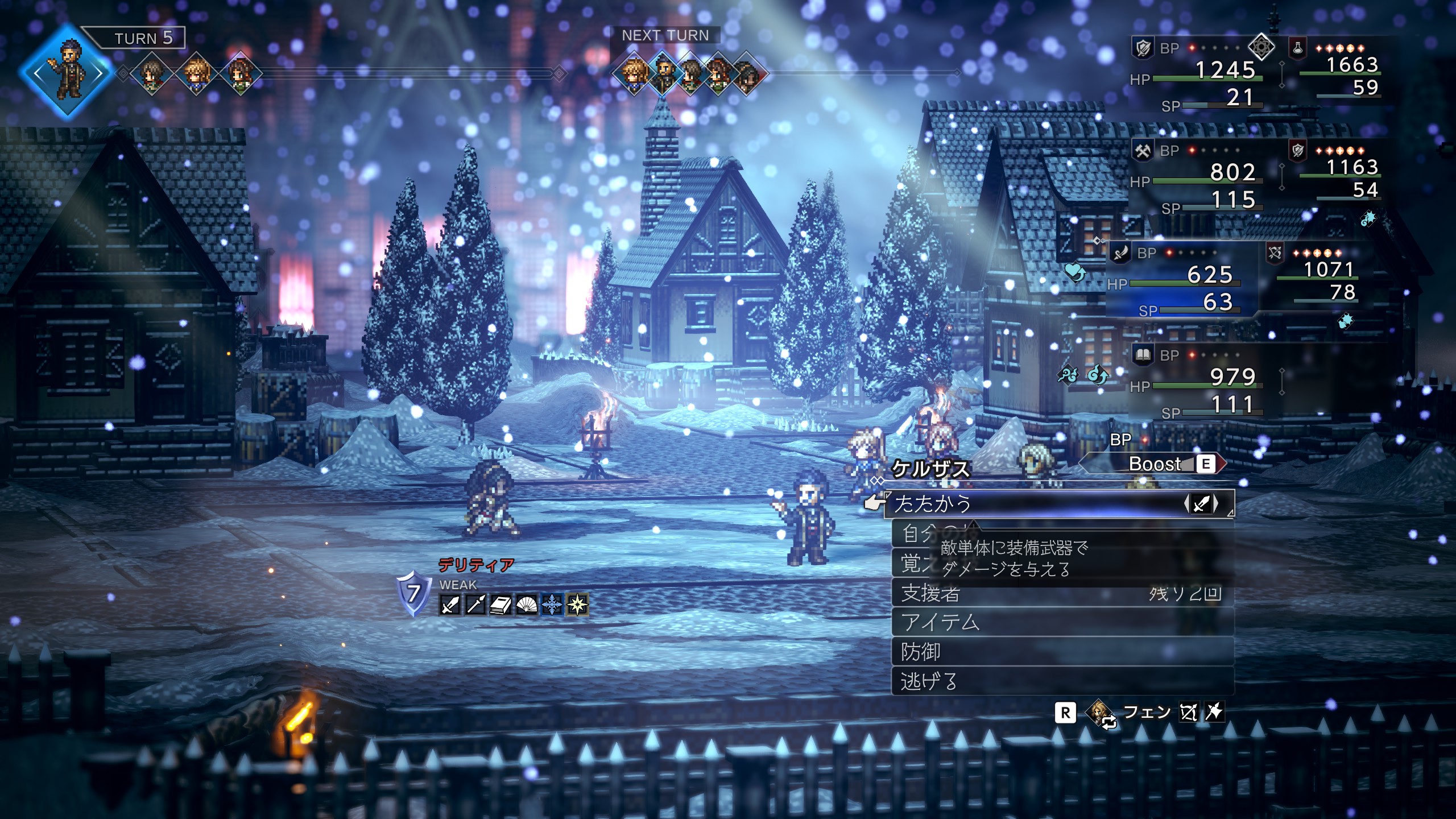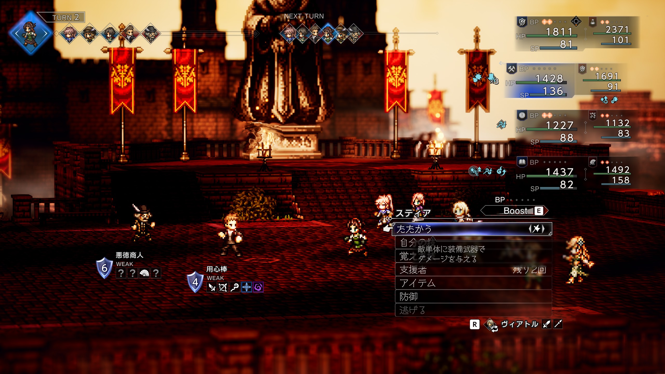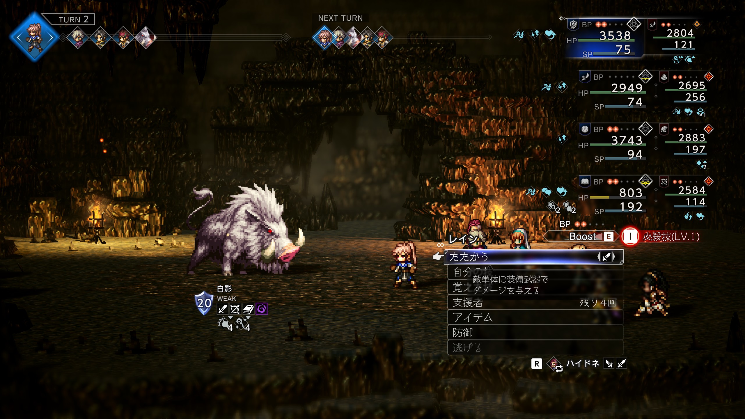 | 攻撃が非常に強力かつ1ターン中に2回攻撃なので注意 物攻ダウンで被ダメが減るのでオススメ 「防壁のオーラ」も使用して味方が落ちないようにしよう。 シールドが24とかなり高いので「全てを極めし者 第4章」で入手した「トリプルアタックの極意」が有用。 「物攻増強のナッツ」が盗めるので盗んでおこう。 ロッソを撃破するとプリムロゼが加入 | |