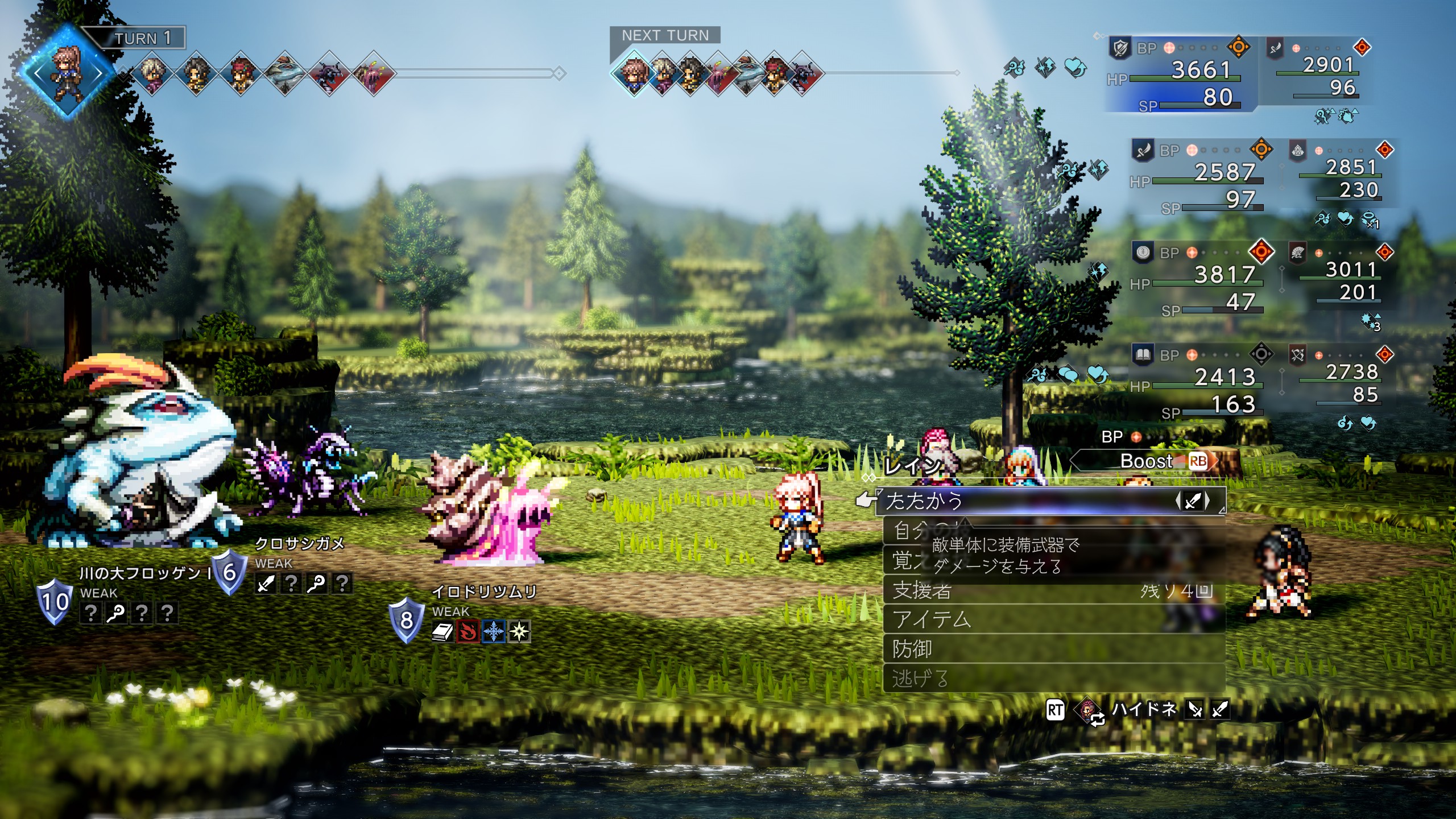| 前衛全体攻撃の強技がありますがHP継続回復をかけておけば回復量が上回るぐらいなので 問題なく倒せると思います。 | |