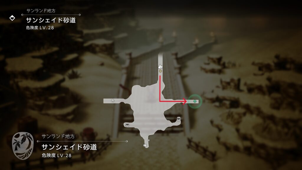 手前にいるシンボルエネミー「獰猛なサンドワーム」を撃破して「防壁のオーラの極意」を装備することをオススメする。