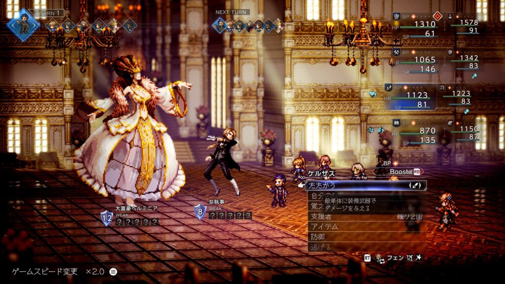 北東から階段を上がり再度ヘルミニア邸に入るとボス「大富豪ヘルミニア」戦