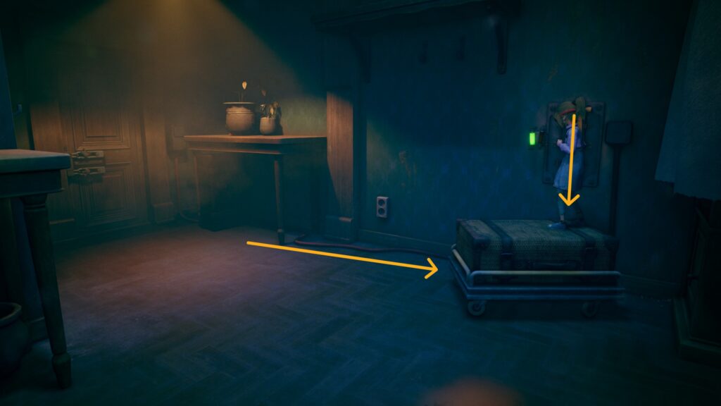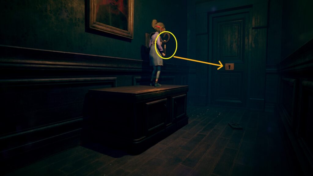 次にソフィで部屋中央の足元にあるスイッチに乗るとテディ視点で右の扉が開く。