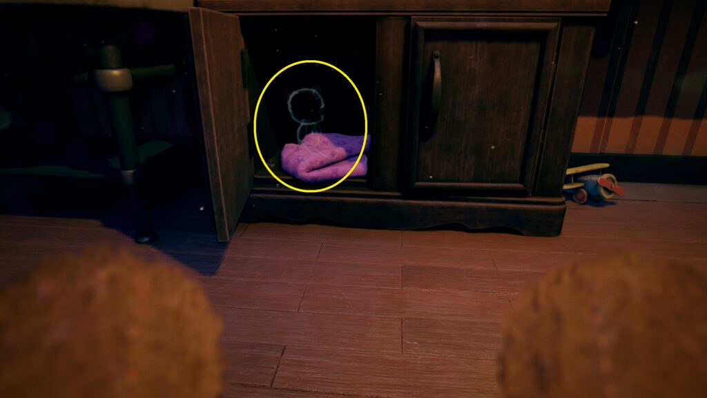 すぐにクレイトンが入ってくるのでテディ視点の目の前にあるタンスの中にソフィで隠れる。