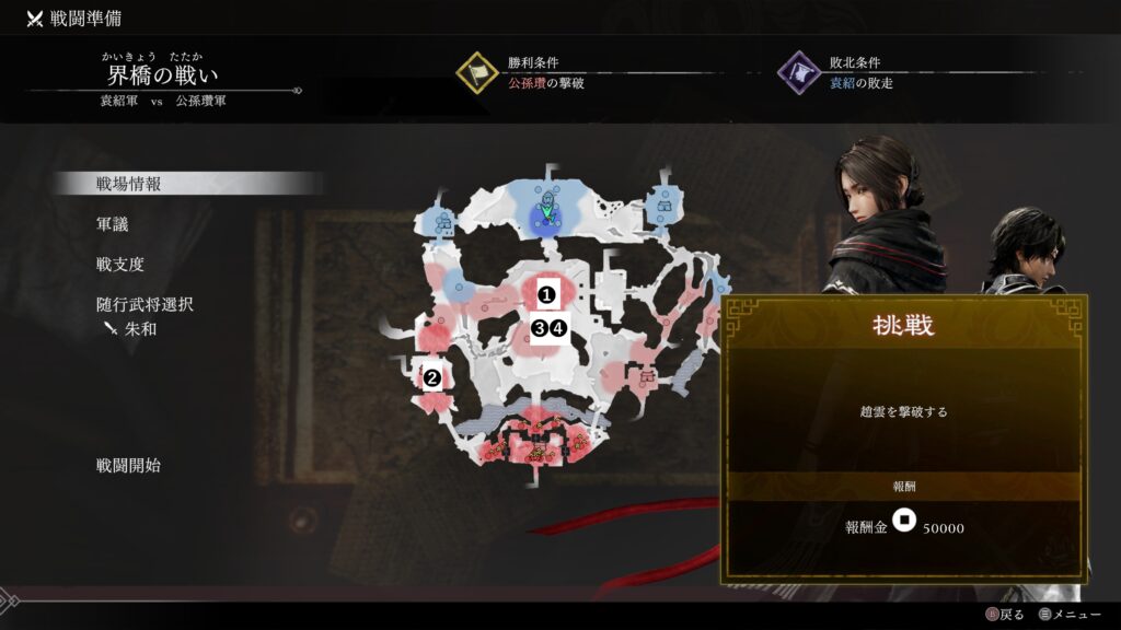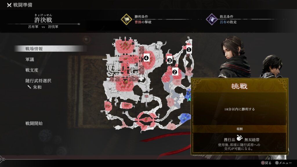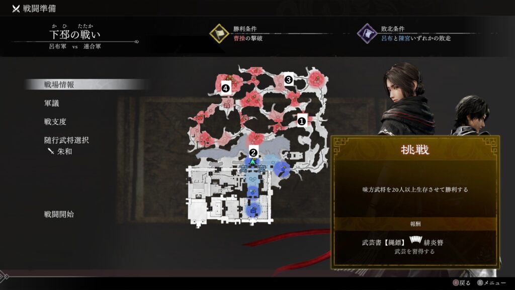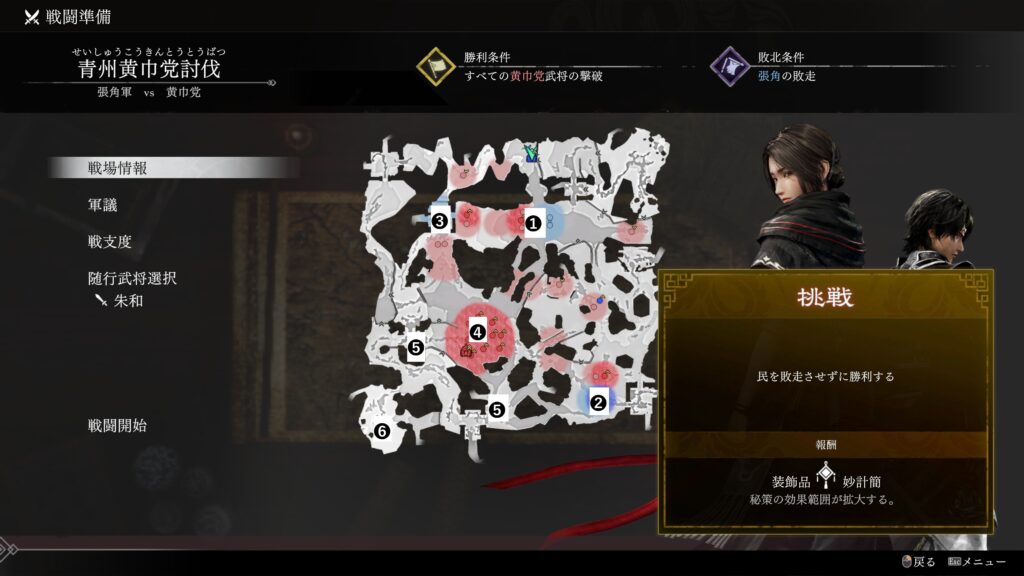 他3人は選ばずとも味方軍で参戦するが朱和のみ随行させないと出現しないため1人でも多く武将がいる方がいいかと思う。