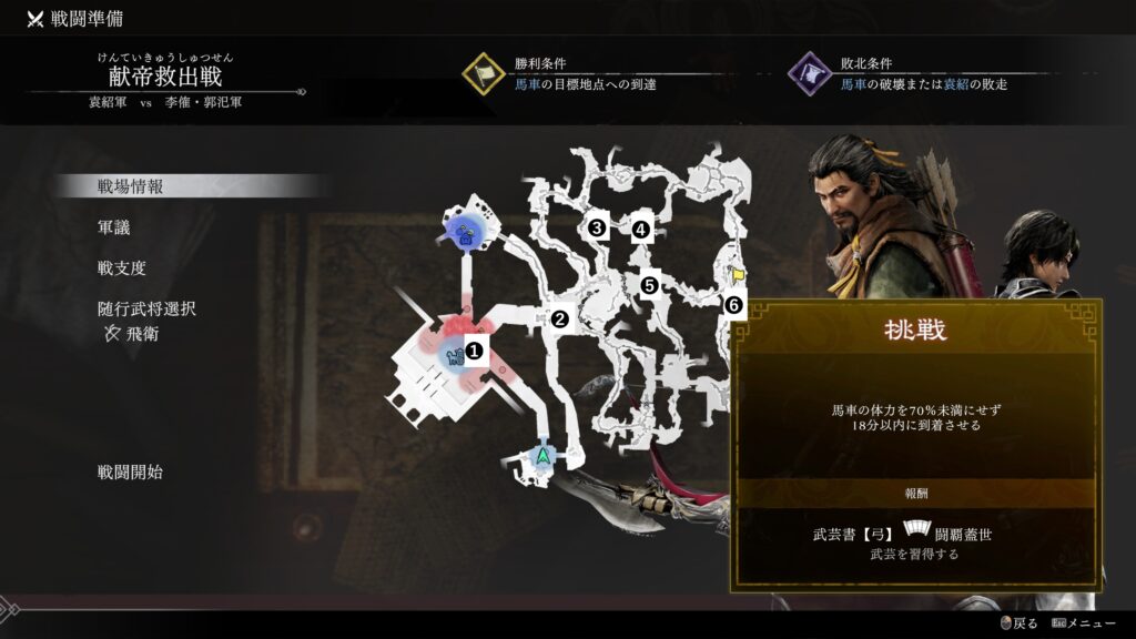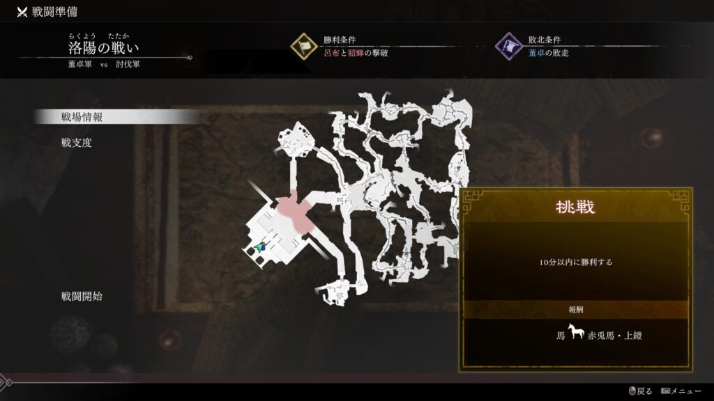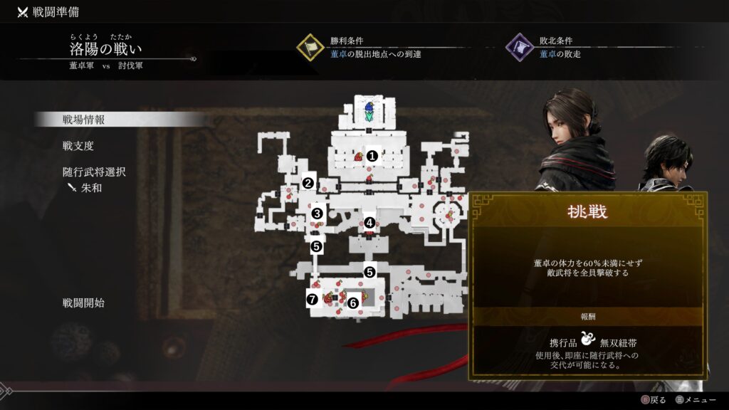 | 条件 | 董卓の体力を60%未満にせず 敵武将を全員撃破する |