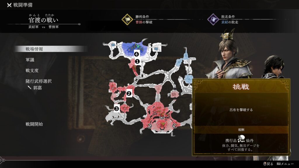 ただし兵糧庫が落ちたタイミングで曹操軍が本陣に突撃するためそれに間に合わせるように「呂布」を撃破するのが推奨 - 「呂布」を撃破したら急いで本陣に戻り曹操軍を撃破する