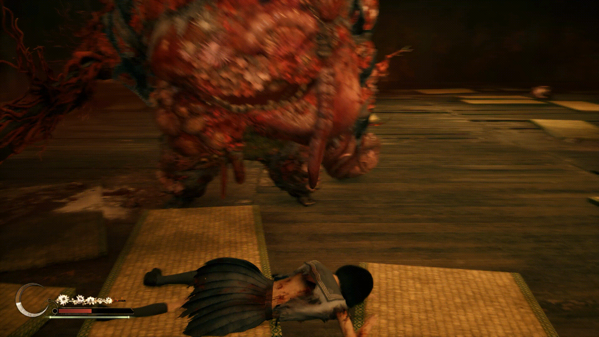![]() 父の左手の触手により父の前に引き寄せられる この後に派生攻撃で以下の叩き斬りに繋げてくる |