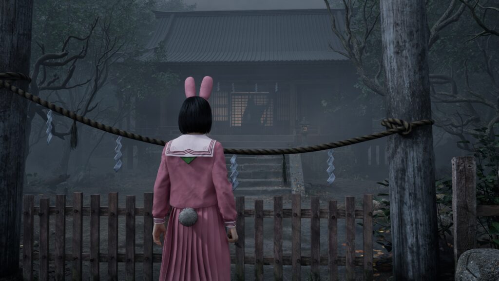 千本杉神社の奥に見える本殿で咲子らしき影が舞っている