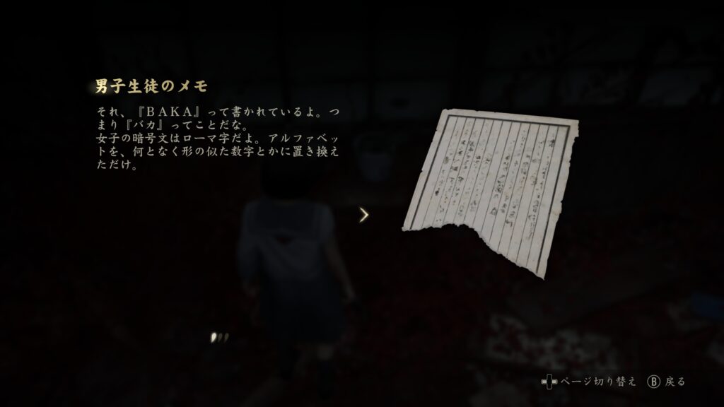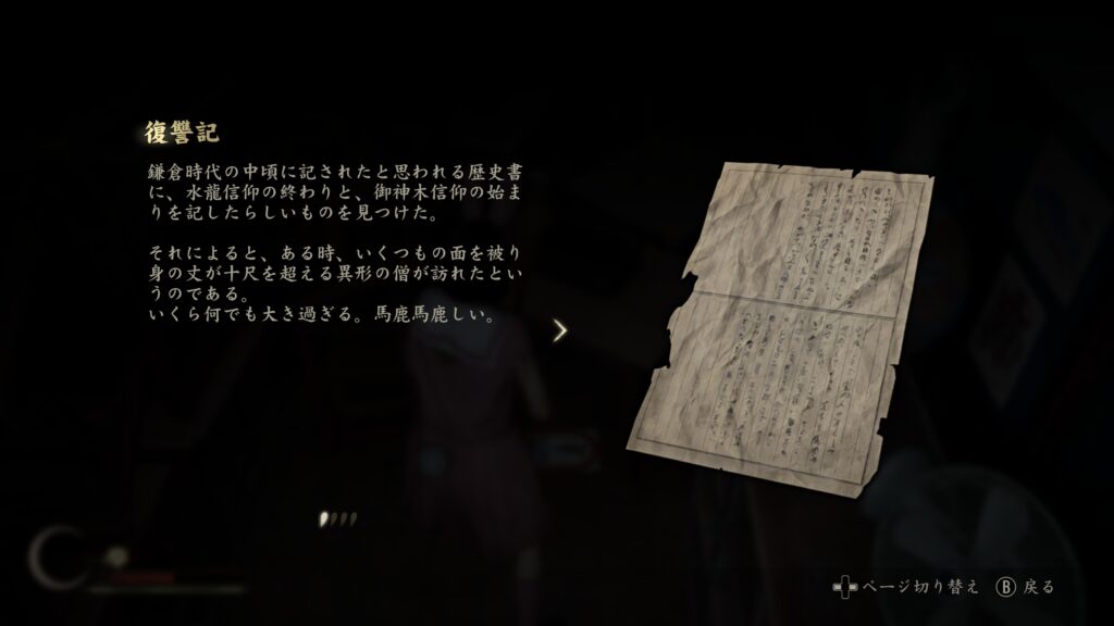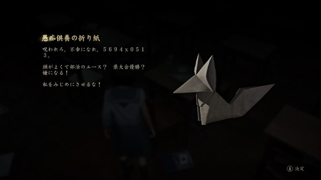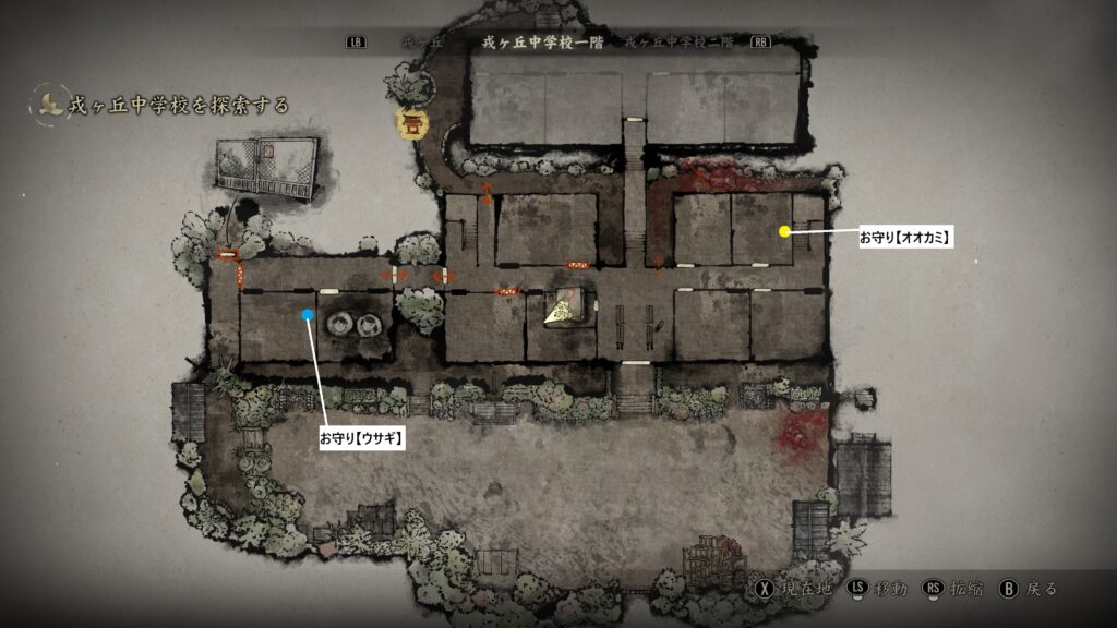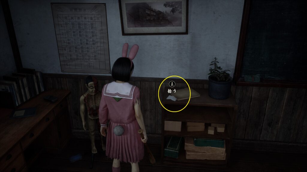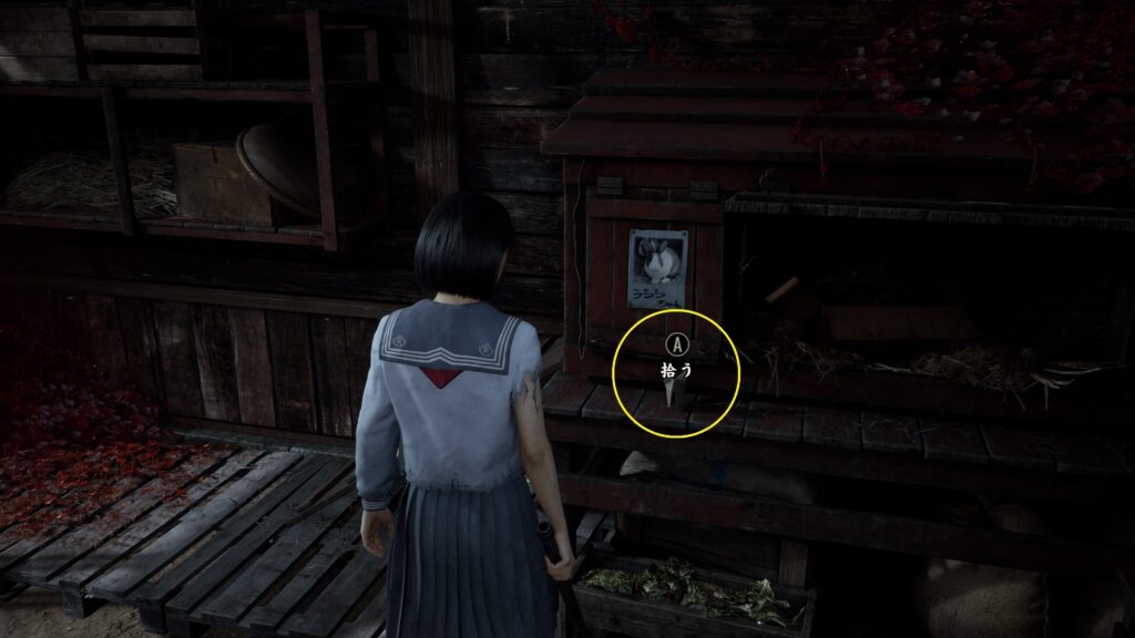 中では箱が置いてあり開ける事で文書「復讐記」とお守り【ウサギ】を入手