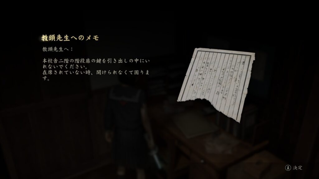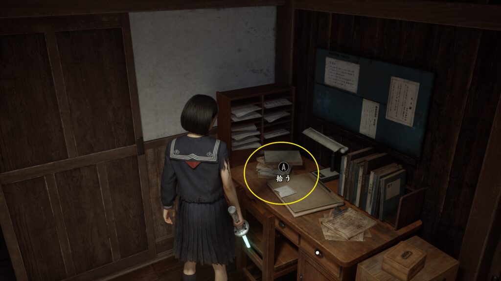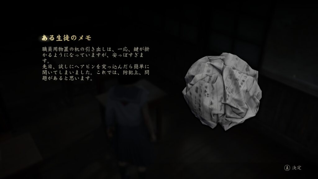 職員用物置にある机の引き出しを「ヘアピン」で開けると鍵を入手