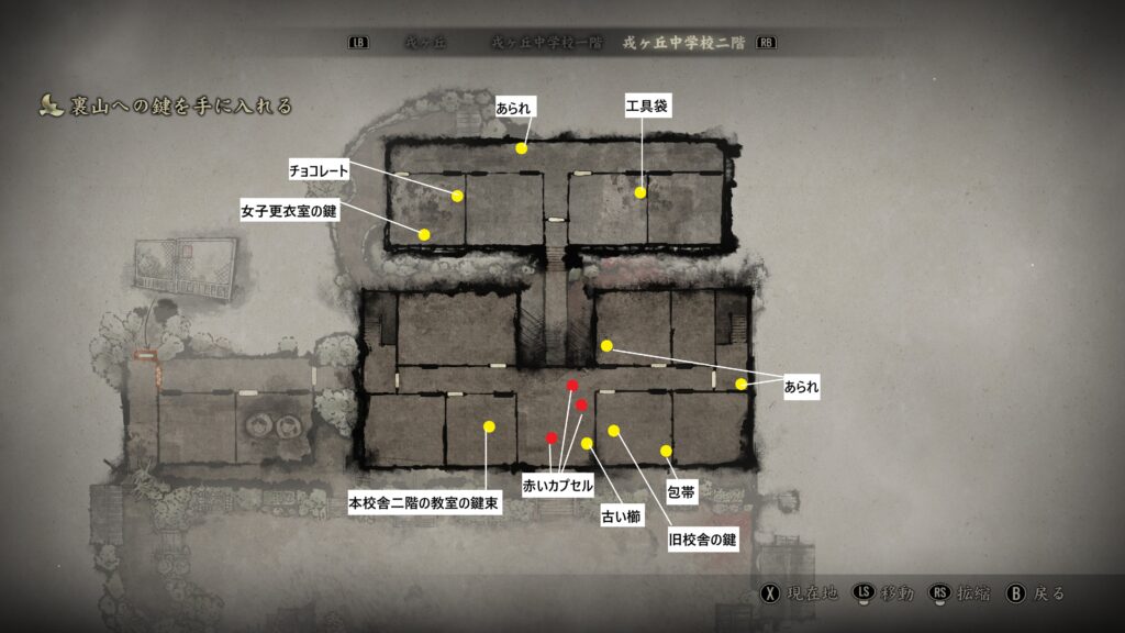 旧校舎西の中学1-1の教室で「女子更衣室の鍵」を入手