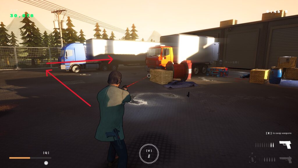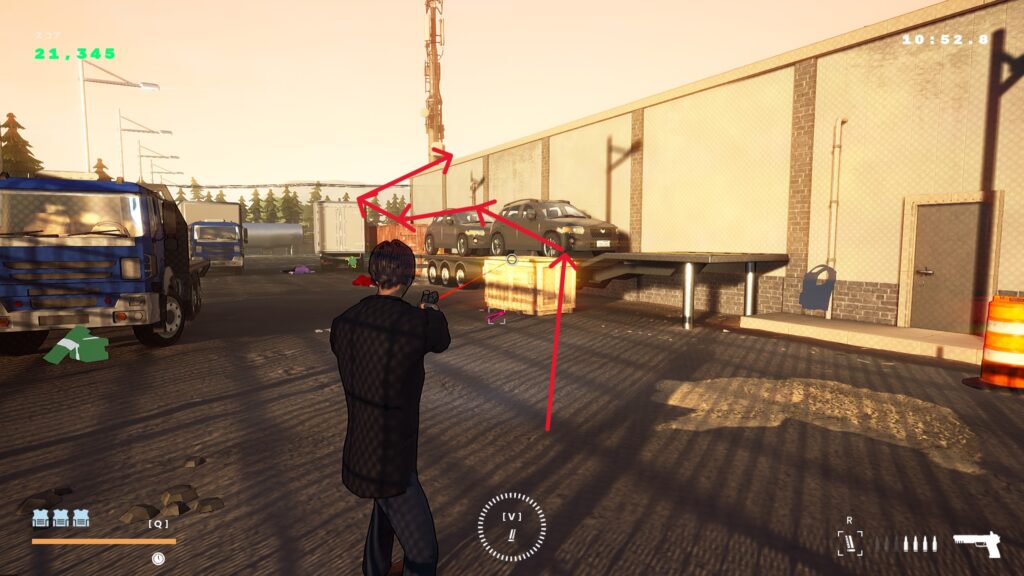 ダイブで段階的に奥のトラックに乗り、トラックから屋上へダイブで乗れる