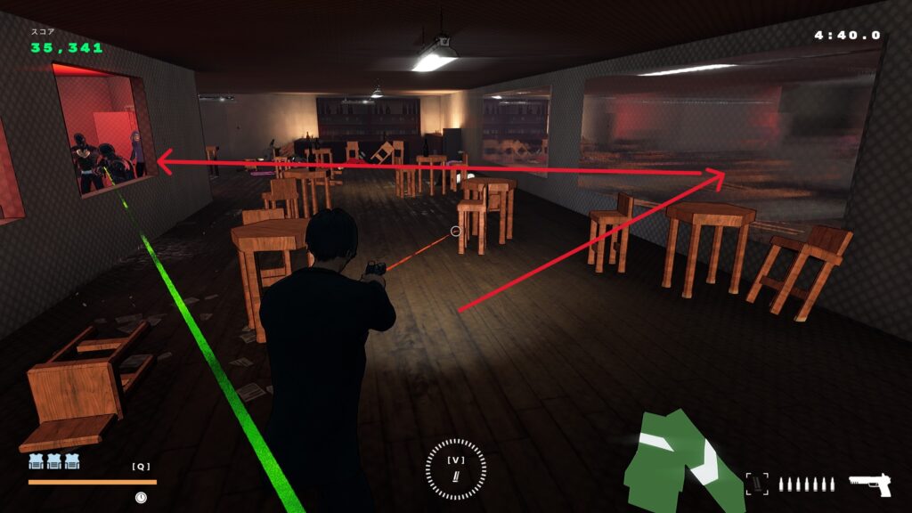 | Eliminate an enemy by deflecting a bullet from a mirror (鏡で弾丸を逸らして敵を撃破する) | |