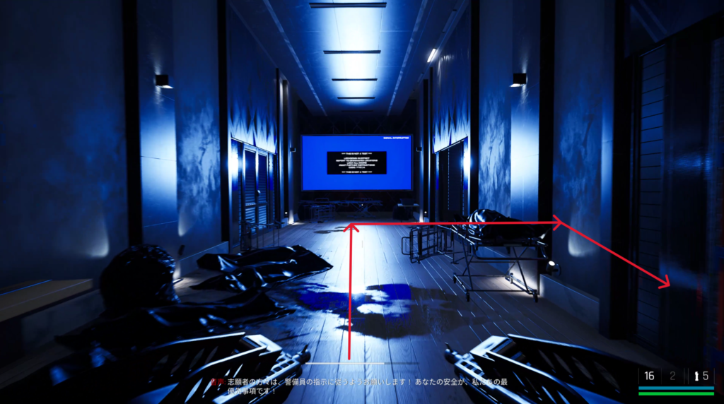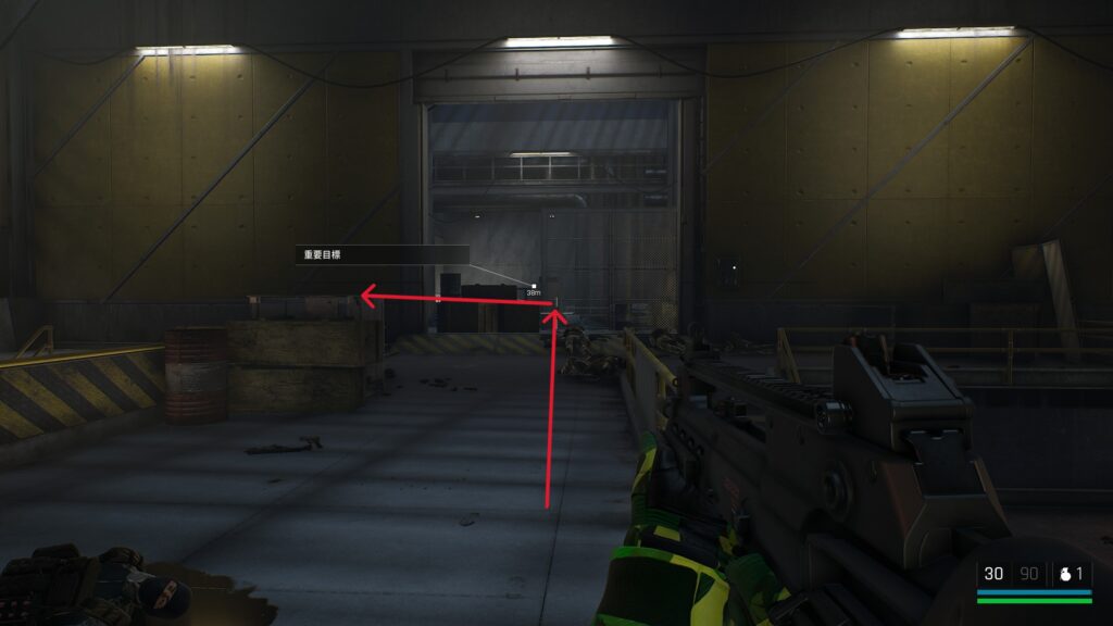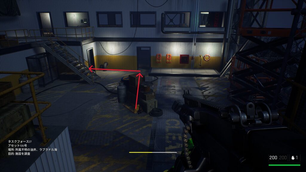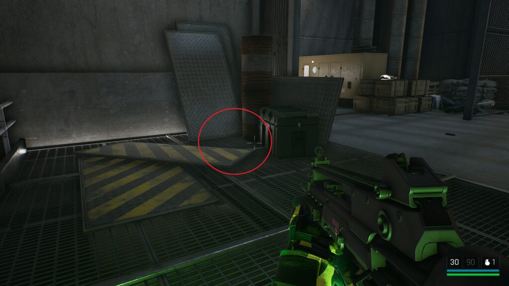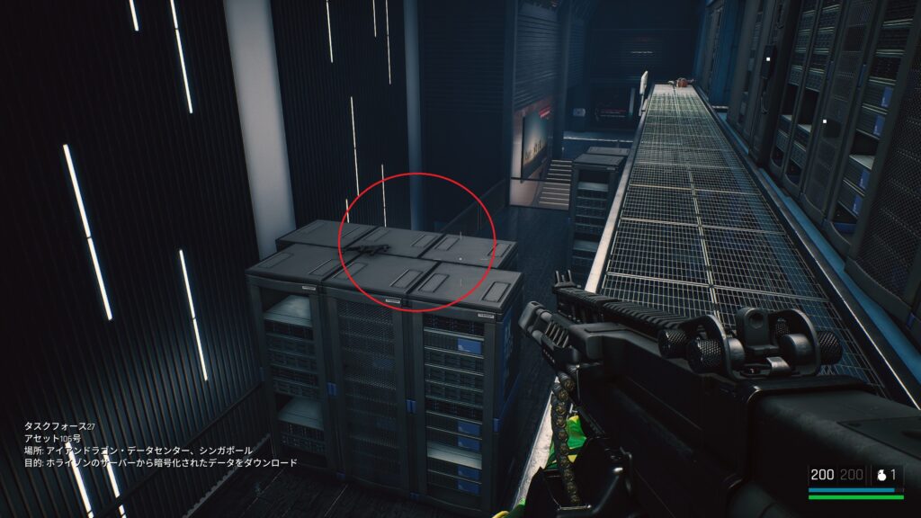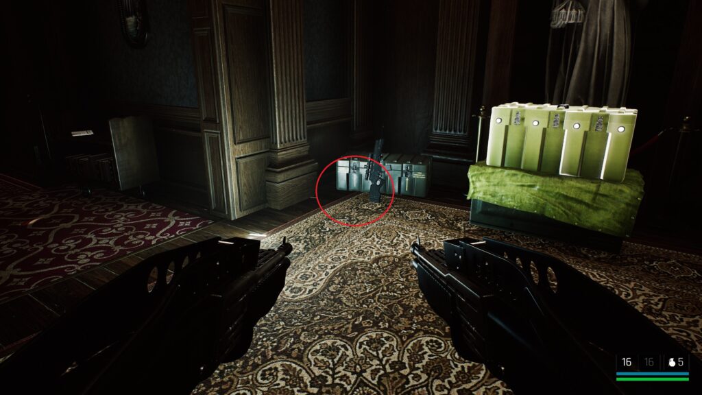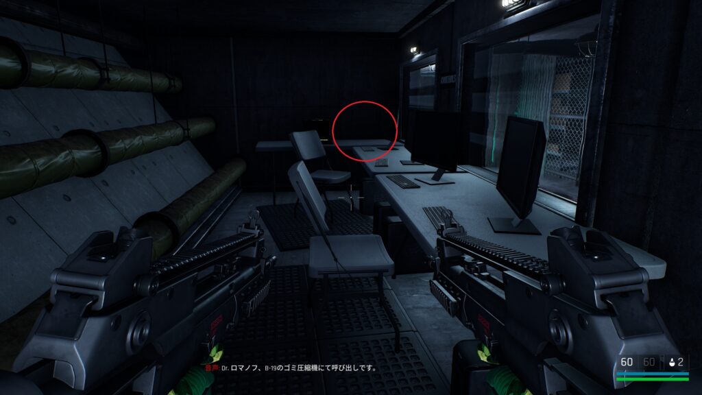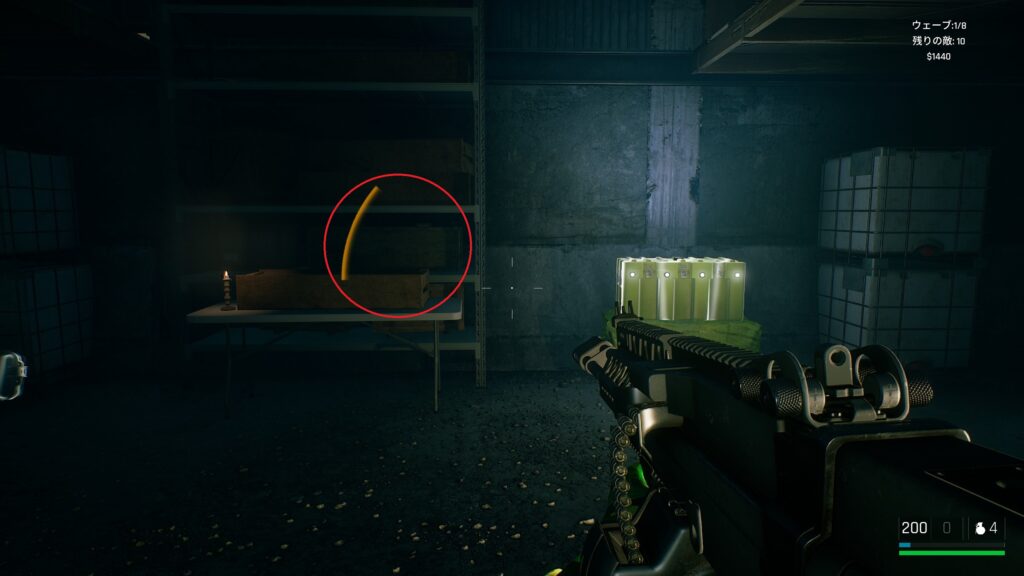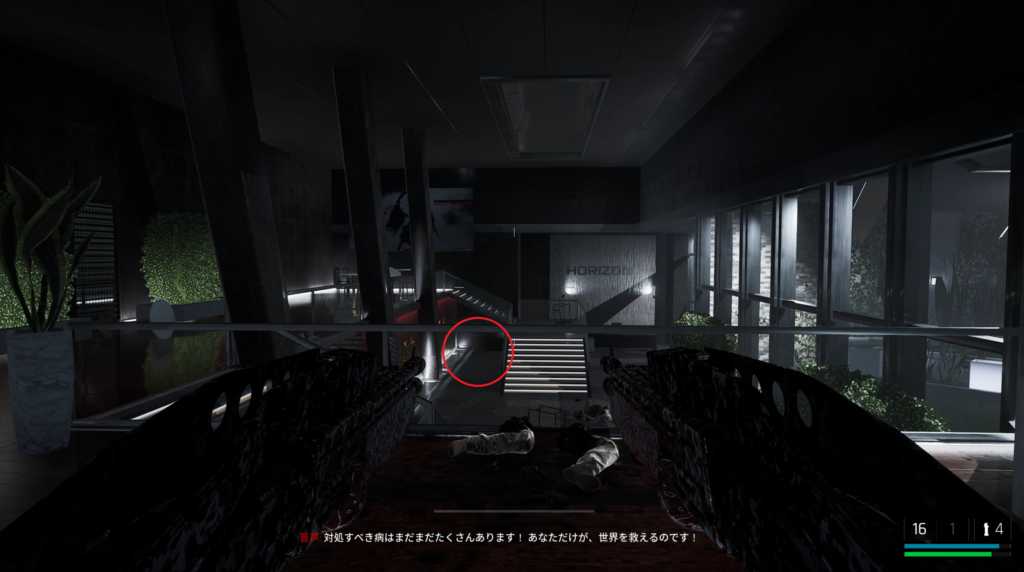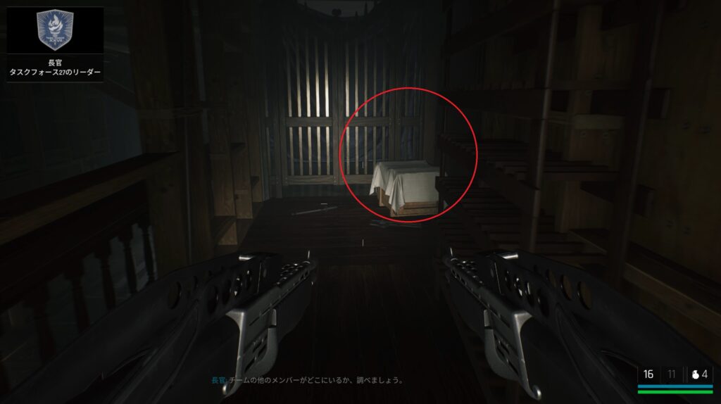 中庭にいる敵を狙撃して戦闘に入る前の武器庫。床の上。