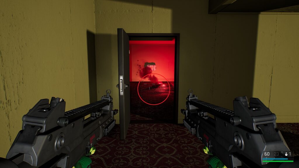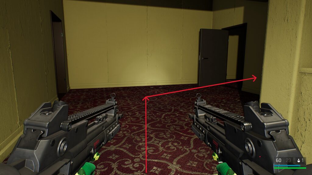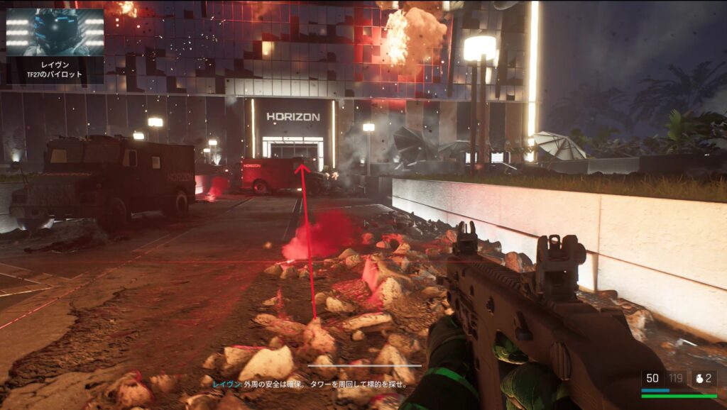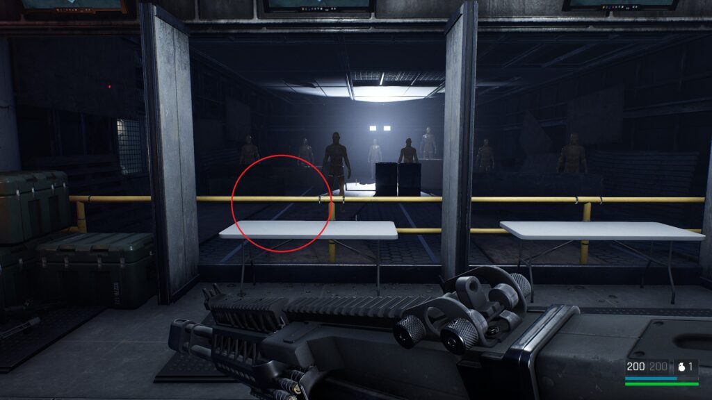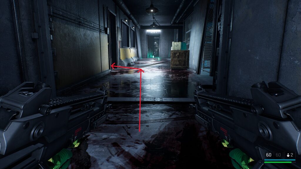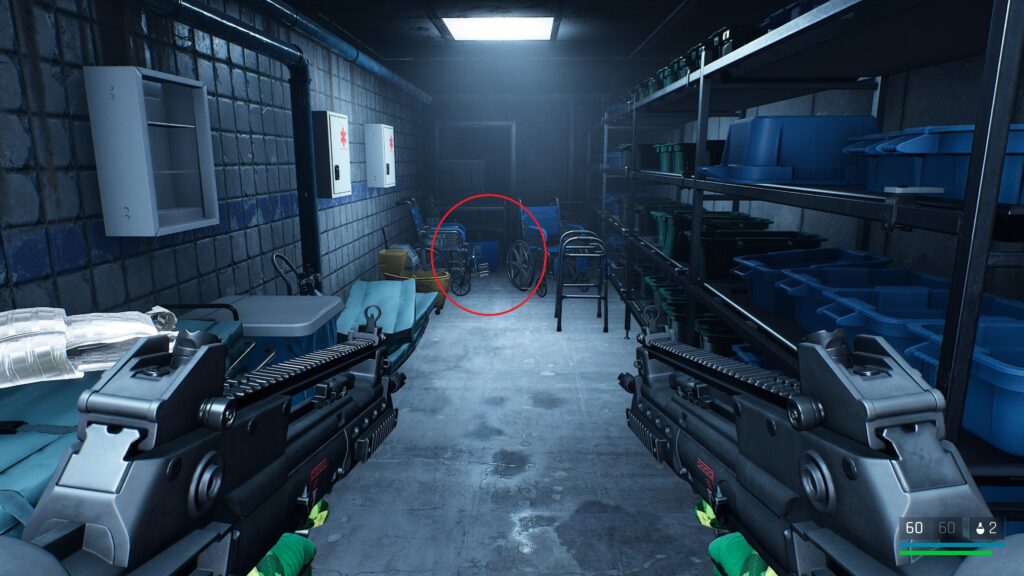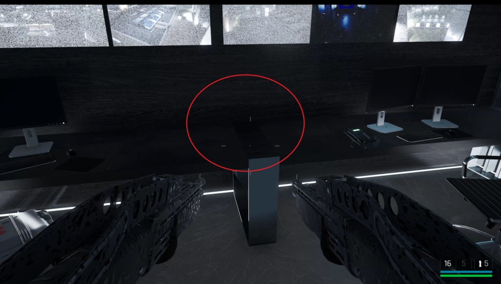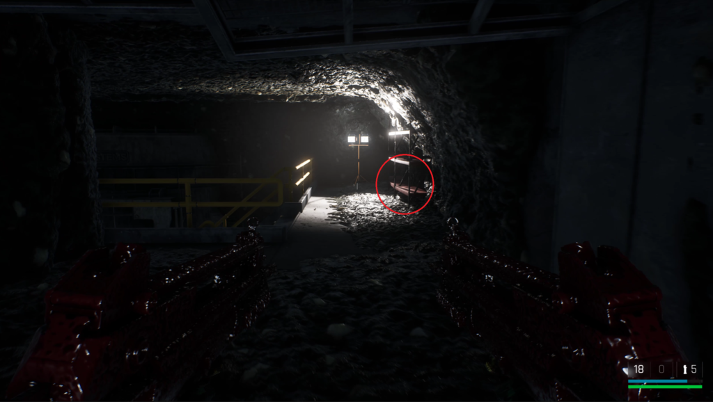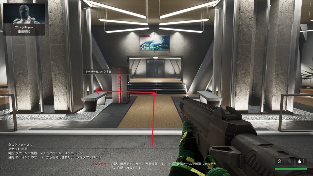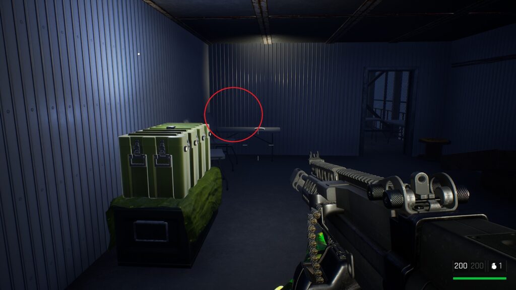 中庭にいる敵を狙撃して戦闘に入る前の武器庫。床の上。