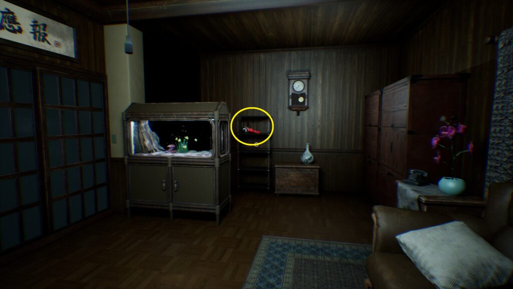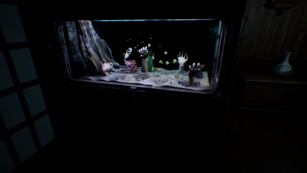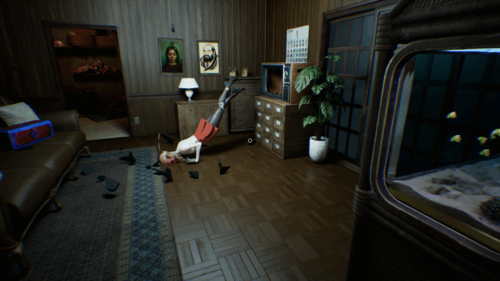 玄関に近づいてリビングから視点が消えると水槽近くの棚に人形の胴体が立っている