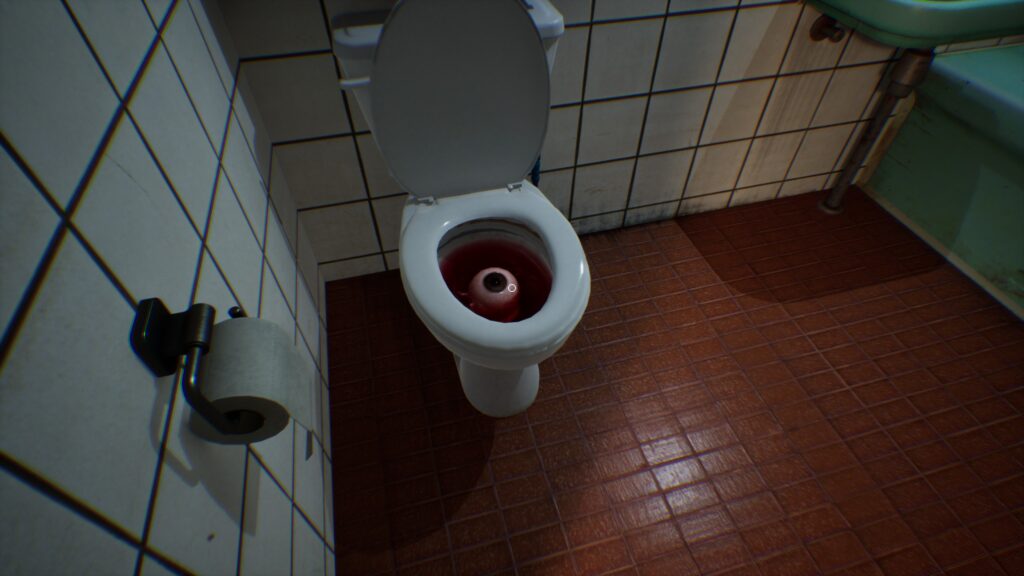 トイレの中が真っ赤に染まっており、紙が沈んだ後目玉が浮いてくる
